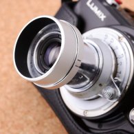 | エルマーに近い外観ならば、エルマー用のレンズフードがはまるのではと思い、手持ちのものを付けてみると、ぴったり同じサイズ。思ったよりも様になる。 |