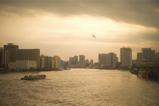 | 夕暮れ時の隅田川を撮影。絞り開放で撮影したものだが、遠景のビルはシャープに描写していることがわかる。絞り開放時の周辺減光は大いにあるが、良いアクセントになっている。(ライカM9 f3.5 1/2000秒 ISO160) |