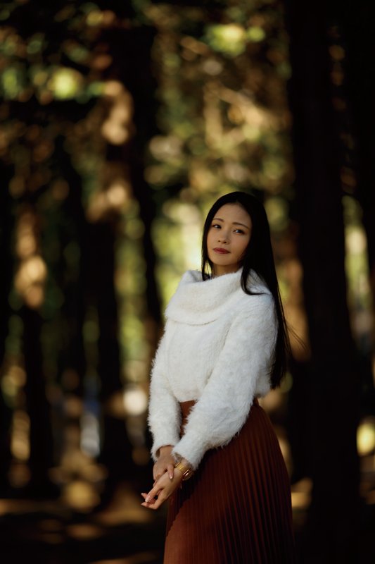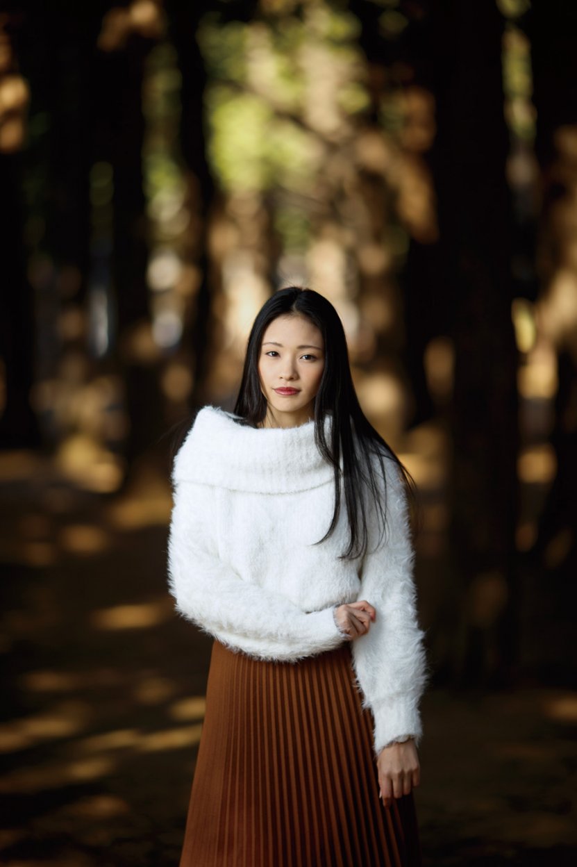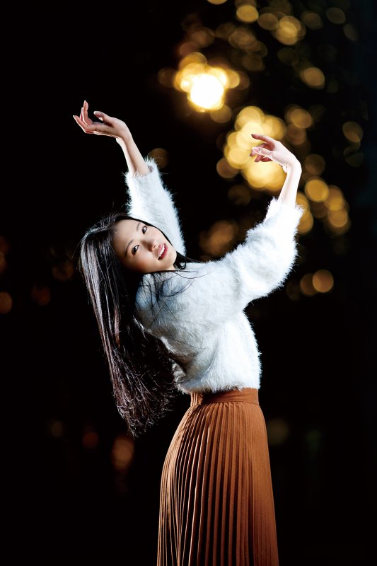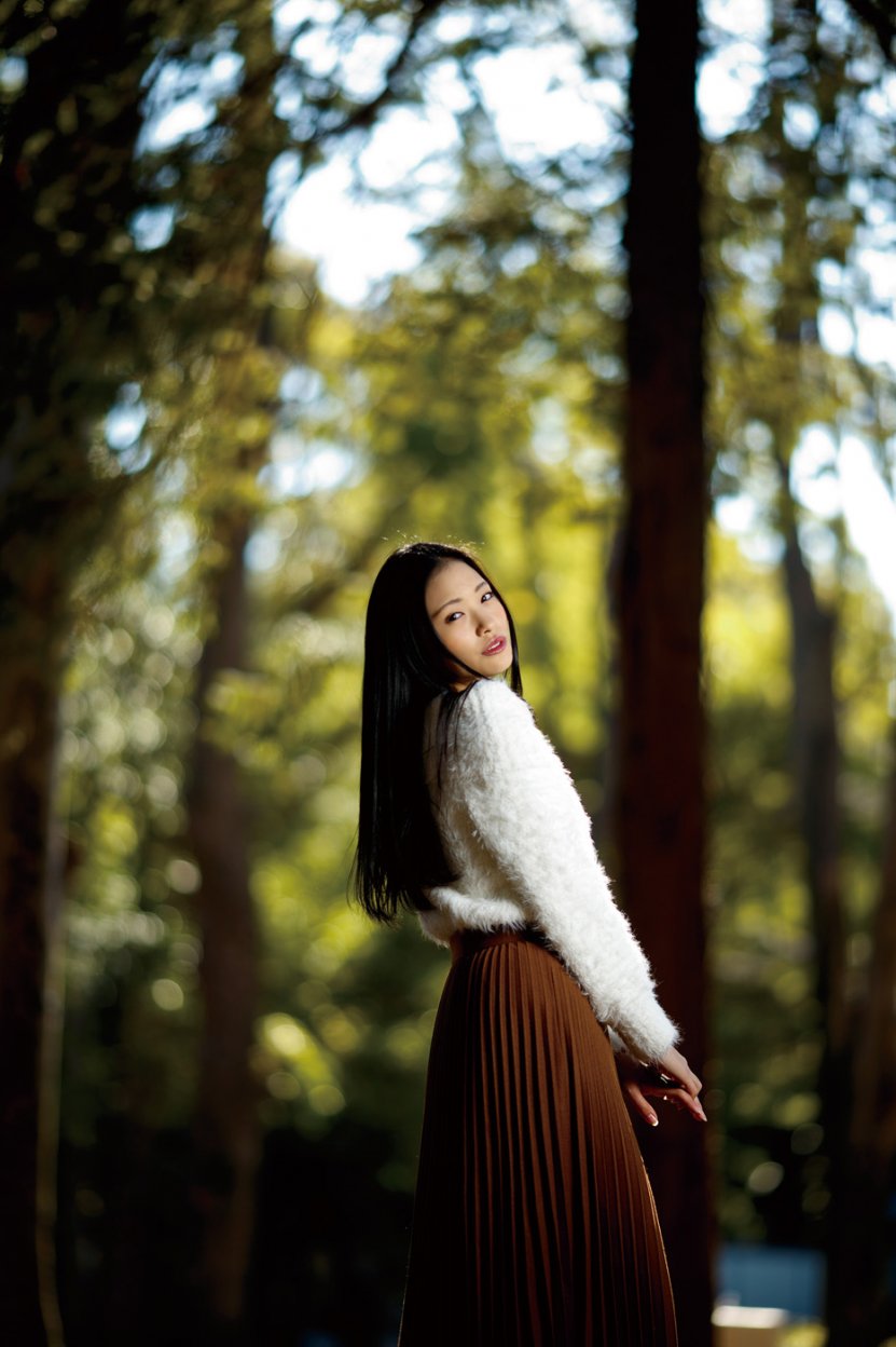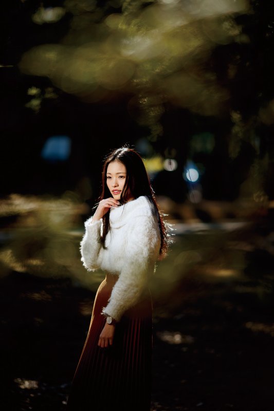 最後に、木のすき間から見えていた夕日を背景にして撮ってみる。木漏れ日を圧縮効果で引き寄せて玉ボケにするために、レンズは200mmを使用。露出は暗闇の中に玉ボケが浮かび上がるぐらいまで落として、自然光の影響がほぼない状態からモデル側の光を作っていった。モデルの正面からはアンブレラを付けたストロボを光量1/2で発光して、顔のやや上から全体にやわらかな光を当てる。モデルの背後からは、背景の雰囲気となじませるために、オレンジフィルターを付けたストロボをほかのアクセサリーなしで1/8の光量で発光させた。