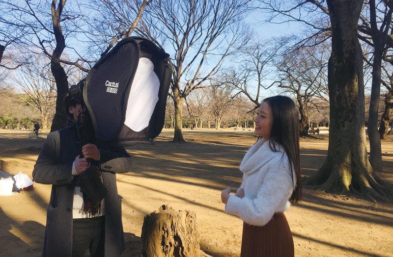 今度はモデルと私の位置を入れ替えて、モデルが太陽を背にしての撮影。雨の日にはモデルの背後にストロボを置いて、雨粒を光らせたりするが、ここでは太陽光をバックライトに見立てるようなイメージだ。硬い光が欲しかったので、アクセサリーはCactusのグリッド付きのソフトボックスを使用。太陽の光で、背景からモデルが浮かび上がっている。