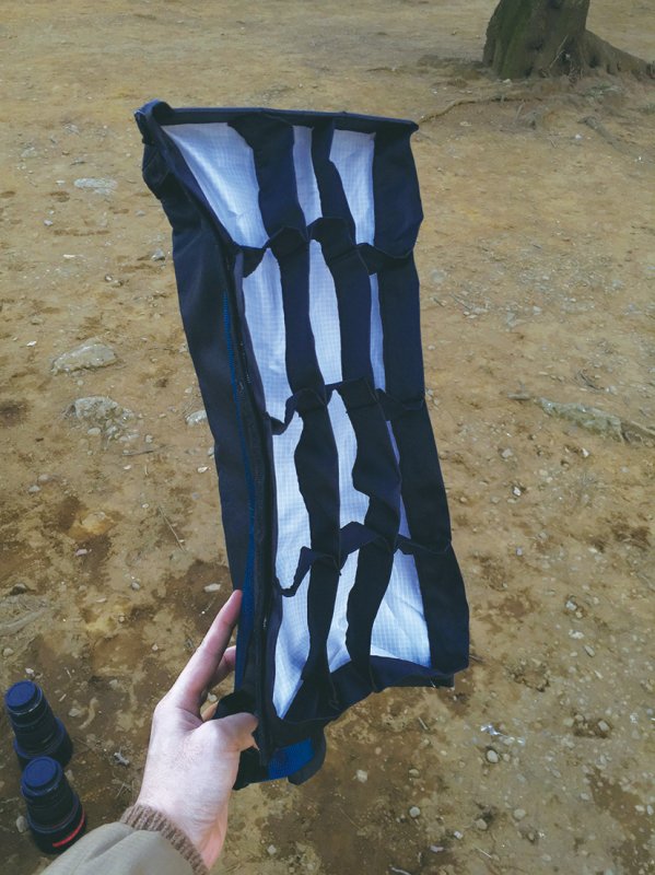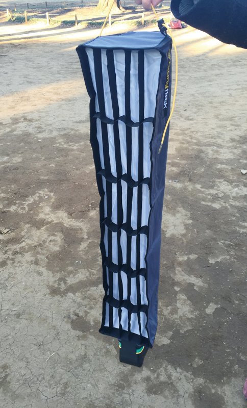 ストリップライトは折りたたみ式のため、使用時にはスタンドにひっかけるか、誰かに持ってもらう必要がある。グリッドが付いているため、光が余計なところに漏れないのがメリット。