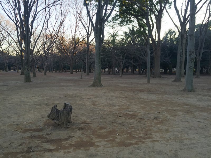 「case 3 背景からの1灯で擬似太陽を演出」と同じ撮影場所の、夕日が沈む直前の様子。樹木が作っていた影は完全に消え、空間全体が日影になっている。空にはオレンジ〜青のグラデーションができ、木々のすき間からはかすかに夕日が見える。