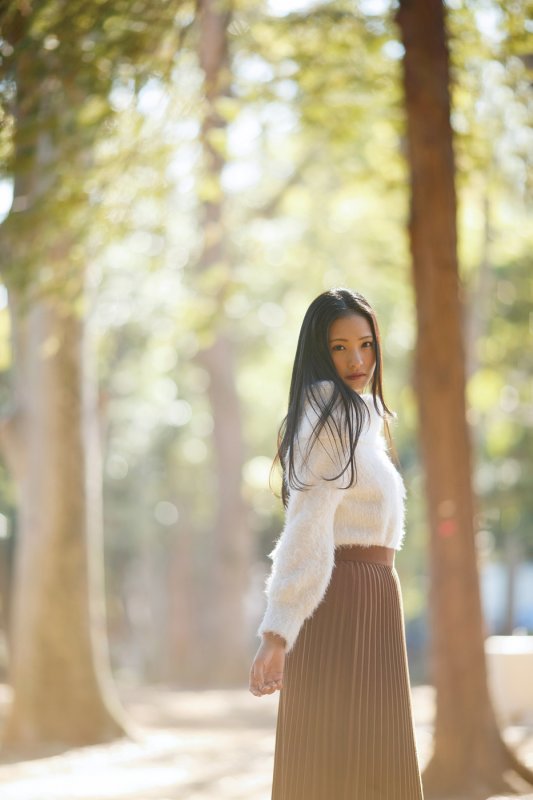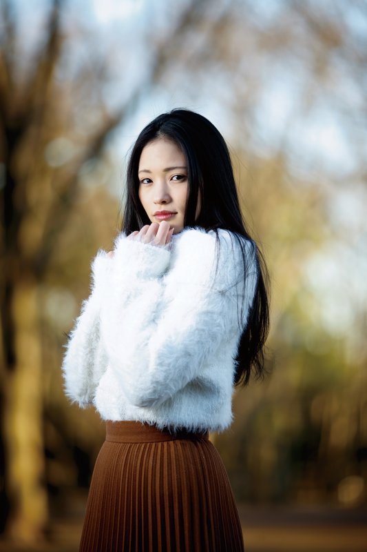 さらに同じセッティングのまま、モデルと私の間に木の枝が入るようなポイントに移動する。135mmレンズの圧縮効果を利用し、光が当たっている木の葉っぱで大きな玉ボケを作るのが狙いだ。順光だと木の葉っぱが白飛びするかもしれないので、やるなら逆光がオススメ。次の項目で紹介するストロボの光量を上げた状態で背景を大胆に落としてもよい。