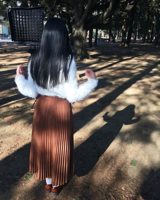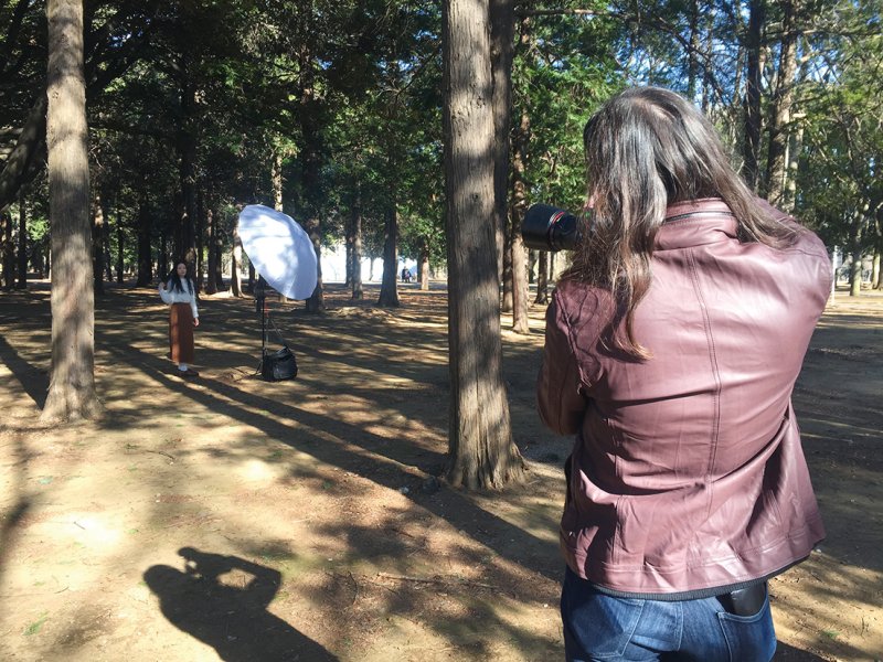 モデルには「自分の影ができる位置に立ってね」とお願いすると、必然的に逆光になる。