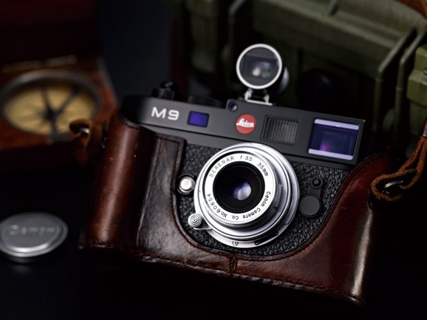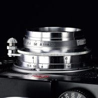 L→Mマウントアダプターを介してライカM9に装着。厚みはマウント部から約2cmと薄く、前玉は直径1cmもないほどだ。