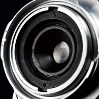 絞り羽根数は6枚。絞り機構にストッパーがないため、絞りは無段階に調整できる。この玉は残念ながら中玉に大きな曇りがある。味と言えば味だが…。 | | レンズの重量は約185g。ピントレバーがついており無限遠で固定できる。海外モデルのためフォーカス指標はft表示。最短撮影距離は3.5ft(約1m)だ。