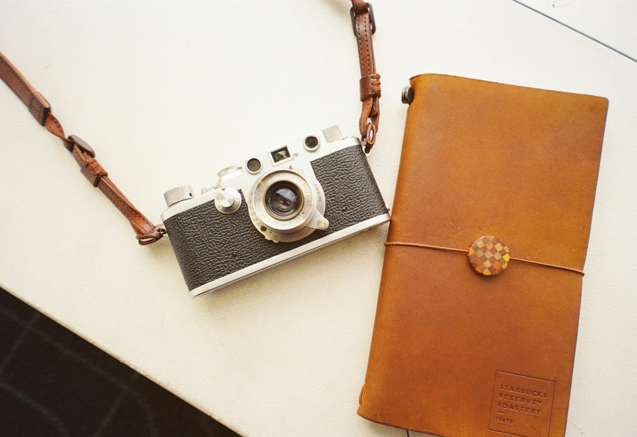 羽田空港にて、出発前の一枚です。Leica IIIfのクラシカルな見た目と革の手帳の組み合わせが好きで、旅に出る前はよく並べて撮ったりしています。