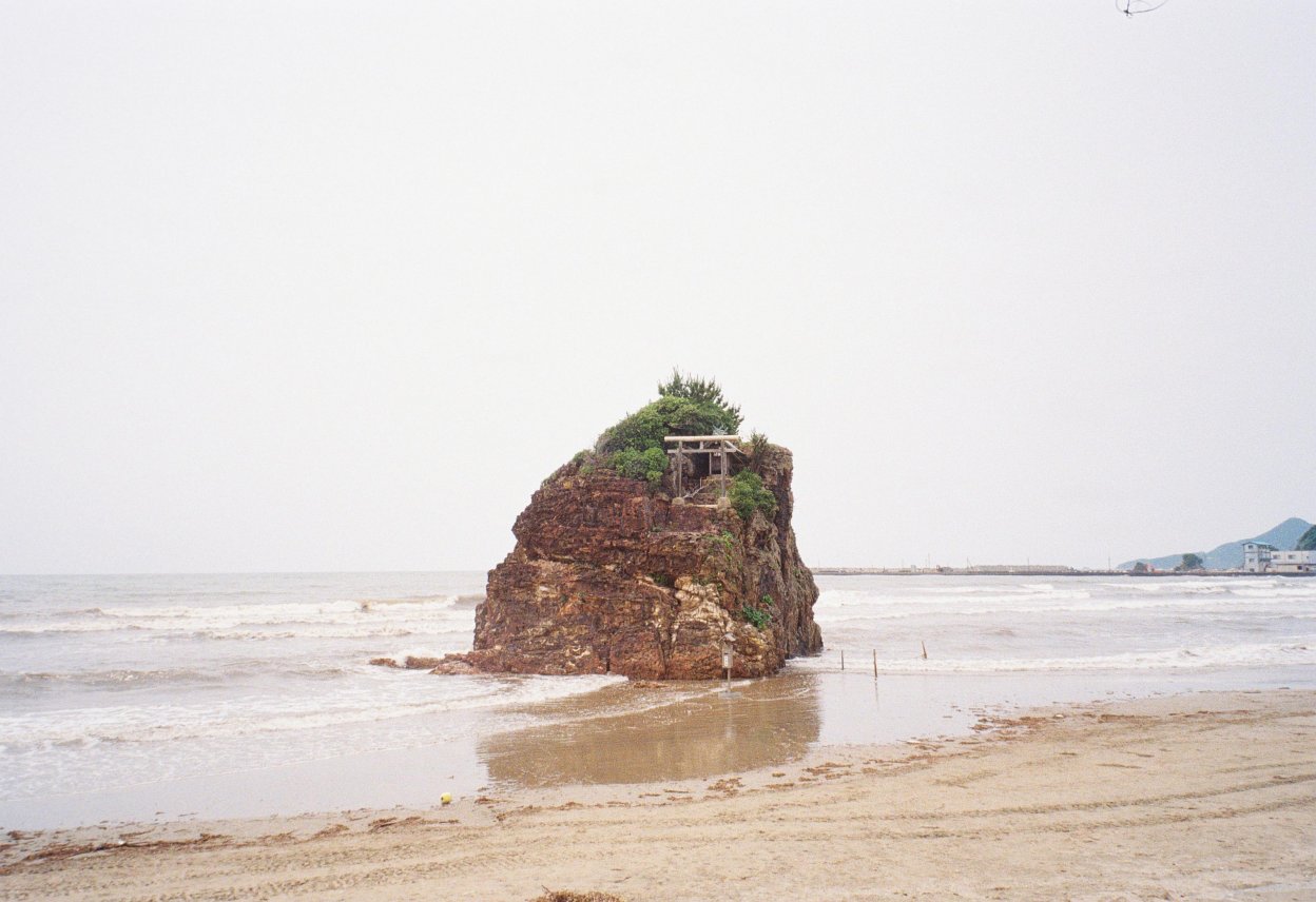 出雲大社に祀られている大国主御神が「国譲り」をした場所という伝説がある「稲佐の浜」です。そこにぽつんと見えるのが「弁天島」。