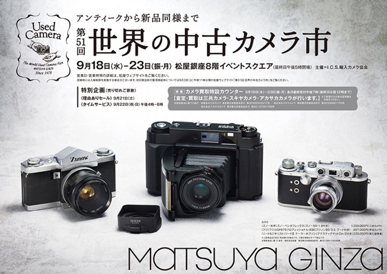 「第51回 世界の中古カメラ市」(主催:I.C.S 輸入カメラ協会)が、東京都中央区の松屋銀座 8階イベントスクエアで9月18日に開幕した。ここでは開催2日目の会場から、筆者およびカメラファン担当者の目に留まったアイテムをピックアップしてお届けする。なお、掲載アイテムはいずれも取材時点での価格・在庫状況であることをお含みいただきたい。