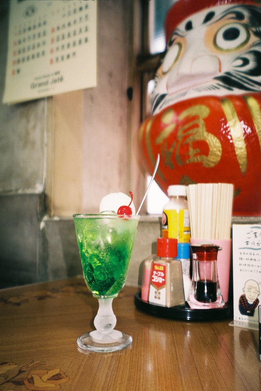 「食堂のクリームソーダ」秩父神社に向かう途中にあるパリー食堂は、地元の人から愛される古き良き食堂です。ランチを済ませた後、秩父神社の参拝後に立ち寄りました。大きなダルマのインパクトがすごいです!クリームソーダと一緒に撮ることで、緑色と補色の赤が引き立つ写真になりました。