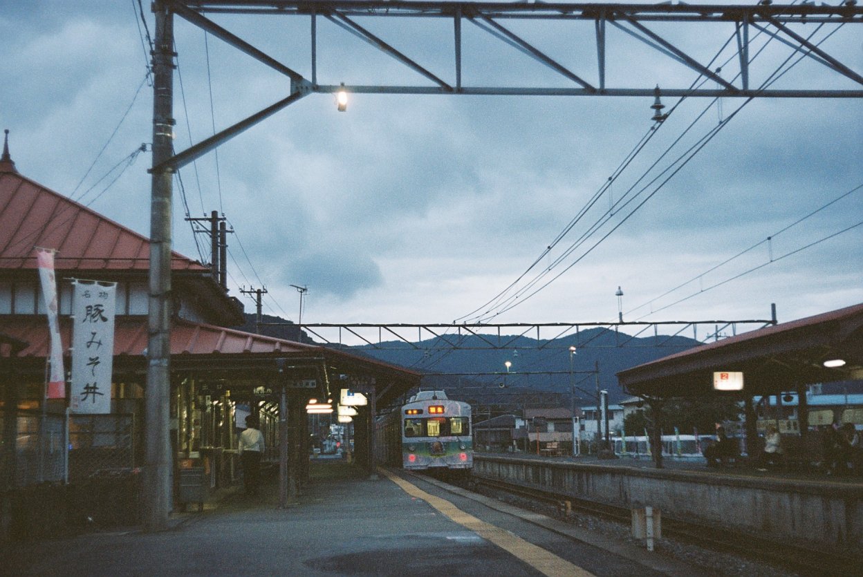「日が暮れる長瀞駅舎」17時台、長瀞駅から御花畑駅へと戻る途中、駅のホームから昔ながらの駅舎が気になって撮影しました。ぼうっと光る電灯に情緒を感じます。今回は一泊二日でしたが、最終日の夕方が一番「帰りたくないなぁ」と感じる時間帯ですね。今回の旅も、複数のカメラとレンズで撮影を行いました。