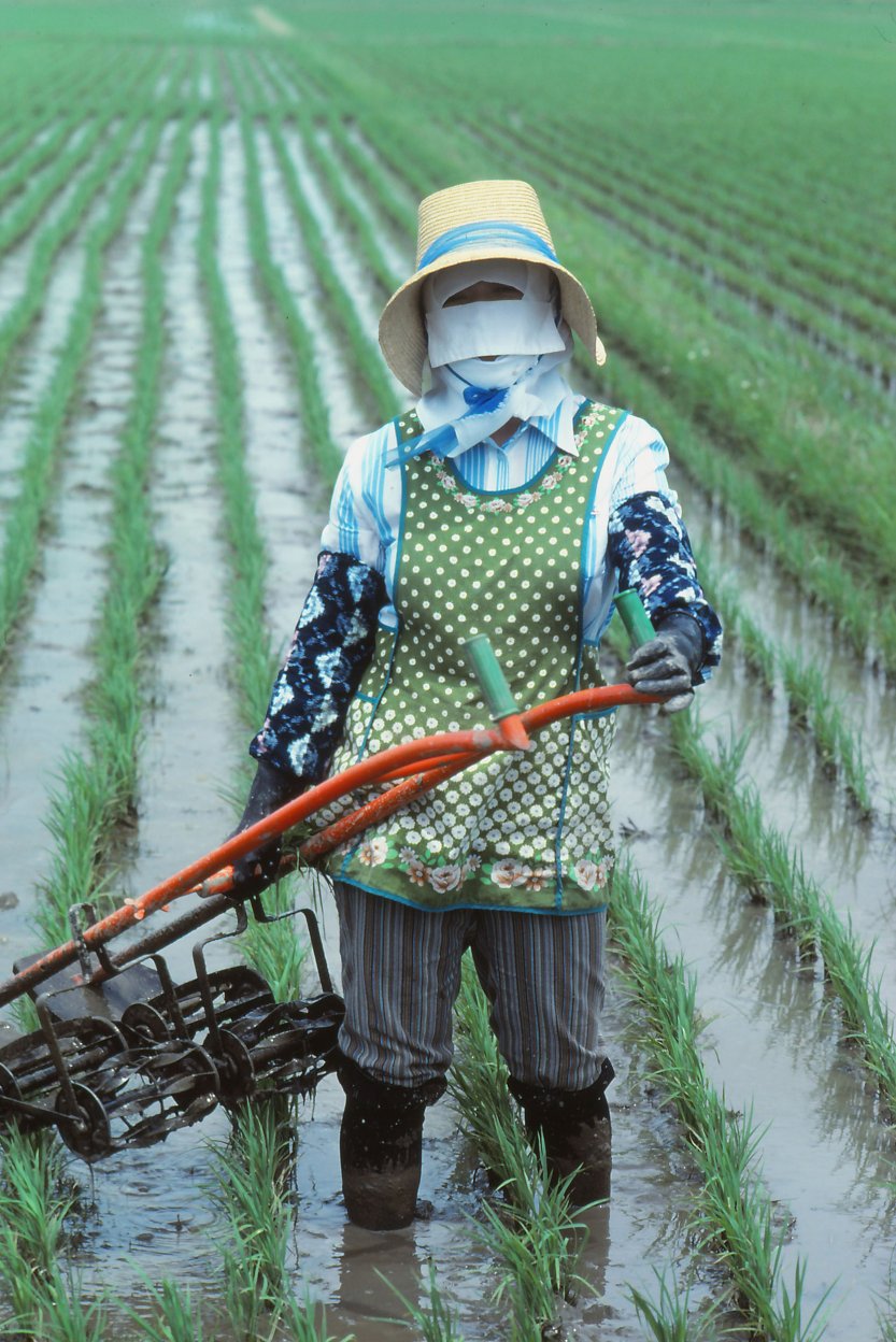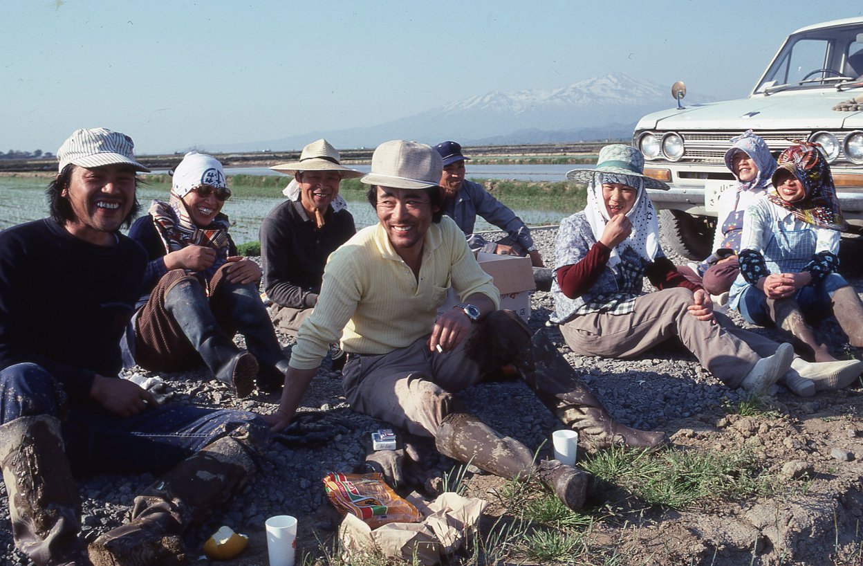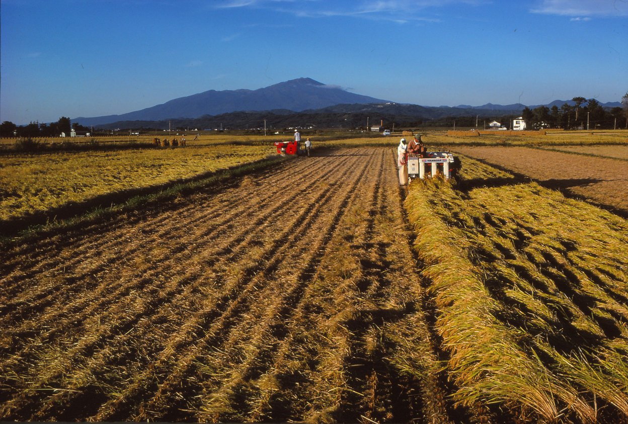 1978年の冬、アサヒグラフ編集部から「庄内平野」に通ってみないかと言われました。田植から収穫期までコメの1年を撮影して、10月の号に掲載するとのこと。行先は山形県の北西部にひろがる庄内平野のほぼ中央に位置する、東田川郡余目町 (現在庄内町) 。1965年、この地で田んぼに女性たちが並んで田植えをしている風景を写したことがあったことと、日本有数の米作地帯である庄内平野はゆっくりと訪れたい場所でもあったので、即ひきうけました。発行元が新聞社ですから、ただ米どころの地を紹介するのではなく「取材テーマ」があります。テーマは「減反」でした。「減反」とは、正確には「水田利用再編計画」と言い、コメの生産量が増えてコメ余り状態になっているので生産量を減らす政策で、1971年から本格的に実施され、78年は大二次減反が始まった年でした。ちなみに「反」は尺貫法で土地の広さのこと。生産地では10アール単位のコメの収穫量を「反収」と言います。