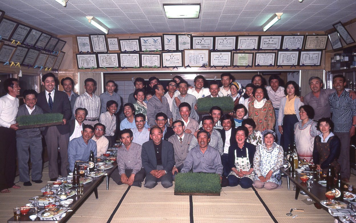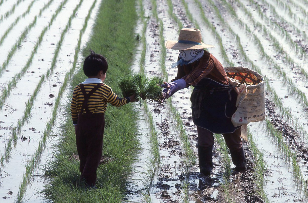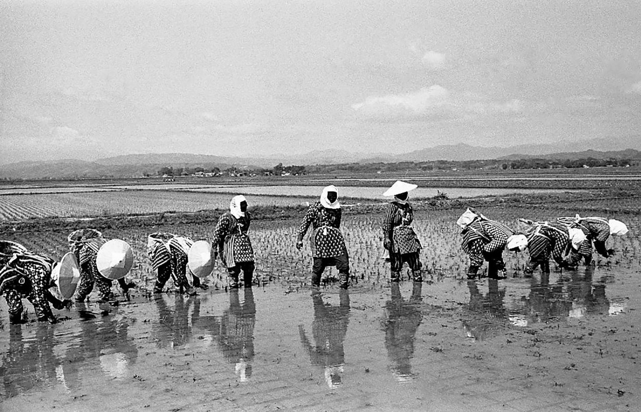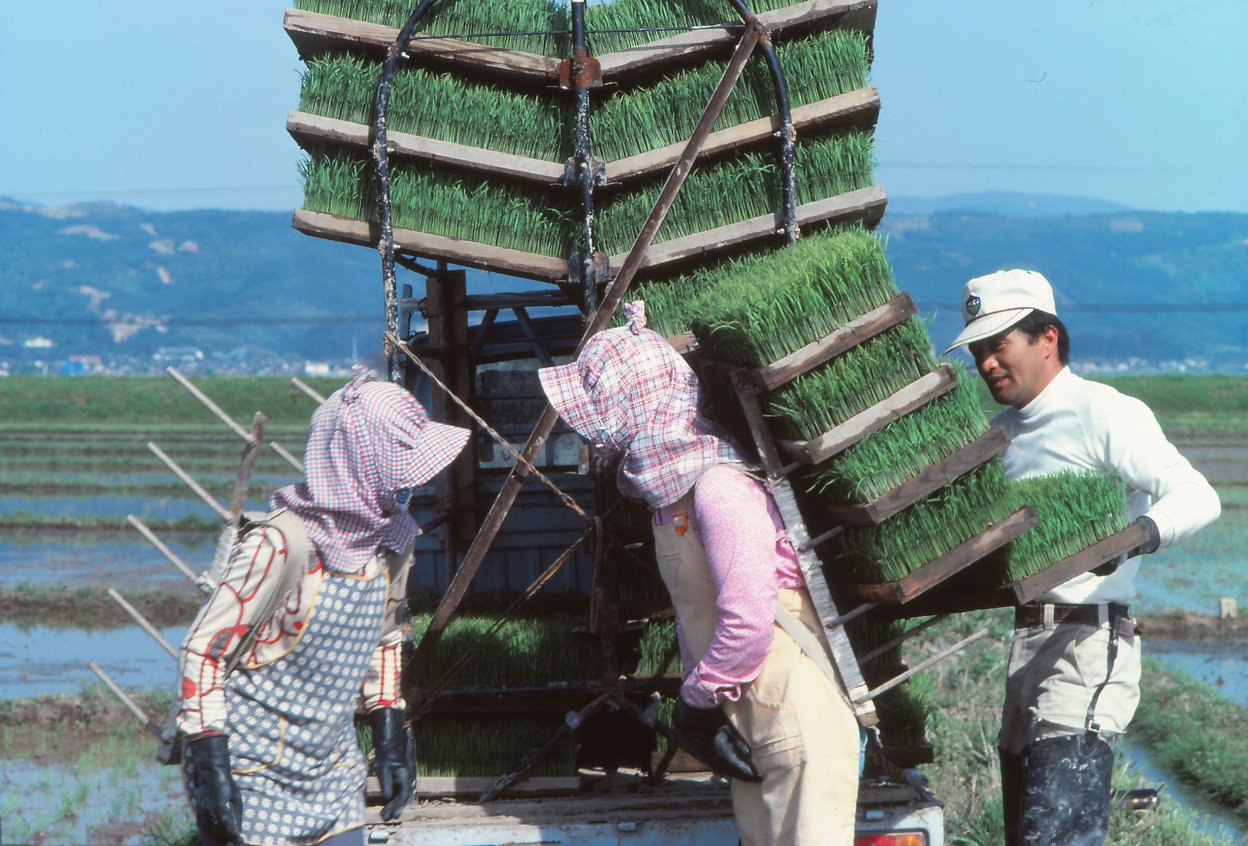 1978年の冬、アサヒグラフ編集部から「庄内平野」に通ってみないかと言われました。田植から収穫期までコメの1年を撮影して、10月の号に掲載するとのこと。行先は山形県の北西部にひろがる庄内平野のほぼ中央に位置する、東田川郡余目町 (現在庄内町) 。1965年、この地で田んぼに女性たちが並んで田植えをしている風景を写したことがあったことと、日本有数の米作地帯である庄内平野はゆっくりと訪れたい場所でもあったので、即ひきうけました。発行元が新聞社ですから、ただ米どころの地を紹介するのではなく「取材テーマ」があります。テーマは「減反」でした。「減反」とは、正確には「水田利用再編計画」と言い、コメの生産量が増えてコメ余り状態になっているので生産量を減らす政策で、1971年から本格的に実施され、78年は大二次減反が始まった年でした。ちなみに「反」は尺貫法で土地の広さのこと。生産地では10アール単位のコメの収穫量を「反収」と言います。