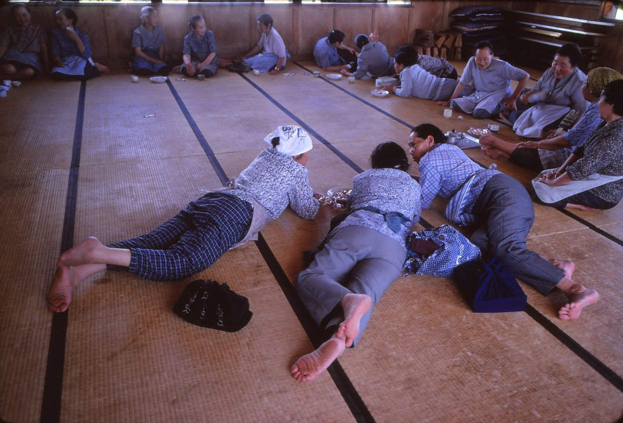 集落の公民館で念仏講の日。お年寄りの女性たちが集まって世間話。