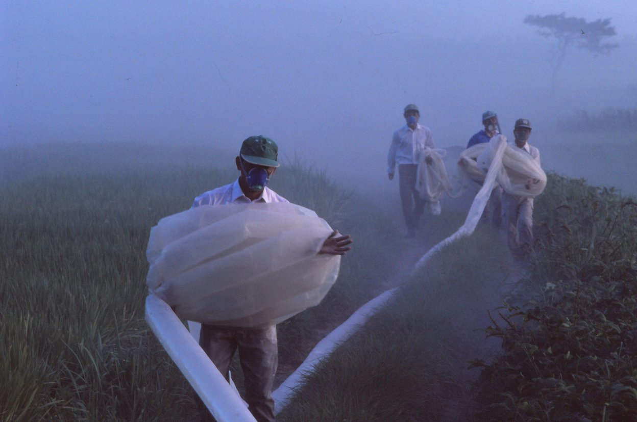6月、共同除の日。高温続きで例年より病害虫駆除作業が多かった。薬剤散布は、薬剤を噴射する穴の開いた長いビニールパイプの端と端を二人あるいは数人で持ち、田の中を歩いて散布するのです。薬剤散布は危険な重労働で、「風上には行かねえようにしろよ」と言われていたのですが、風の流れが変わって白煙のような中に紛れ込んでしまい、マスクなどしていない私は走って逃げたのでした。今日では減農薬、無農薬栽培が広く行われる時代になっています。育苗では化学肥料を使わず有機肥料で、木酢液、竹酢液が使用されていて、種子消毒、殺虫・殺菌の農薬は不使用、肥料は有機肥料、除草剤、殺虫・殺菌材使用せずというコメ作りをする人も増えてきています。