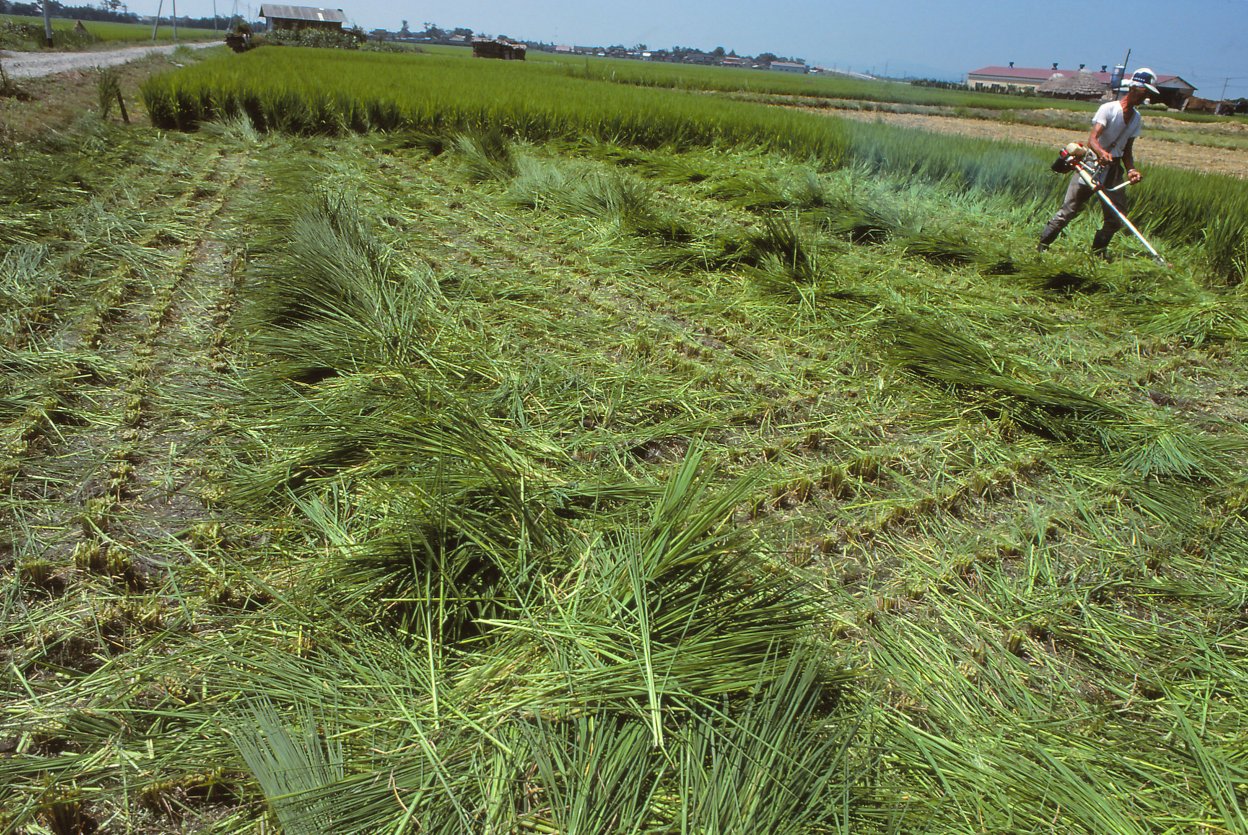 コメの品種は全国的人気のコシヒカリをトップに、ひとめぼれ、あきたこまち、つや姫などから北海道のゆめぴりか、青森県の青天の霹靂(へきれき)といったご当地銘柄米の人気が盛り上がりを見せていますが、この時代コメと言えばコシヒカリとササニシキの2大銘柄米で、庄内平野のコメといえばササニシキでした。ところが1993年日本列島を襲った大冷害の影響を受けて、ササニシキは表舞台から姿を消すことになるのです。ササニシキは寒さに弱く、倒れやすいという弱点がありました。粘りのあるコシヒカリに対してさっぱりした味のササニシキファンは少なからずいて、現在生誕の地の宮城県などでわずかに作られています。寿司飯にはササニシキが合うとうことで、お寿司屋さんからの注文が多いのだそうです。今回の写真群は、ササニシキ全盛時に「庄内ササニシキ」を作る余目町へ5月から10 月の間毎月のように通って撮影したのコメの1年です。