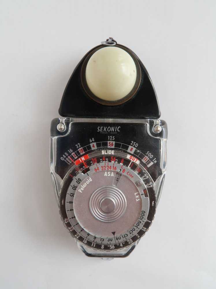 印刷原稿として使用する写真は、モノクロ写真はプリント、カラー写真はリバーサルフィルム(スライドフィルム、ポジフィルム)でした。1970年代はカラーネガフィルムの普及でアマチュアの世界ではカラープリントの人気が出て、印刷原稿用ではエクタクロームが主流でした。「庄内平野」で使用したフィルムは、ISO64のコダクローム64(KR)とISO25のコダクローム25(KM)。「コダクローム」は1935年にアメリカのイーストマン・コダック社が発売したカラーリバーサルフィルムで、現像中に色素を作る発色剤・カプラーを入れるタイプで「外式カラーフィルム」と呼ばれました。クリアーな画質と深みのある発色から印刷用35ミリ判カラーリバーサルフィルムとして、印刷物が写真の発表の場だったプロカメラマンにとってすぐれた印刷原稿用として必携のフィルムでした。グラフ誌の見開きでも鮮明な画像で再現されました。ただ、複雑な現像処理なので限られた現像所でのみ処理可能というのが難点でした。コダクロームは2009年に販売終了となりました。セコニック入射露出計