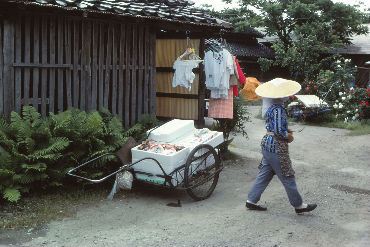 まだイネが緑のうちに刈り取ることから「青田刈り」、と呼ばれました。イネを草刈り機で刈り取っている人に、「もう穂が出ていますよね」と声をかけてもその人は、何も言いません。私は黙々とイネを刈り倒していく様子をただ写すだけでした。刈り取ったあとの田んぼを役場の係の人が見てまわり、きちんと指示通り刈り取ったかどうかを測って確認するのです。その役目をすることになった役場のYさんと田んぼを回ったのですが、彼の家もコメ作り農家なので終始複雑な表情でした。コメがスーパーなどの店頭から消えて大騒ぎになった令和の今、この写真を見る人は驚くより怒るのではないでしょうか。1970年にスタートした減反政策は、1978年は第2次減反の年で、生産調整量を170万トンにする目標がたてられたのでした。「減反政策」は2018年に廃止されましたが、今日でも地域ごとに生産調整が行われていて、飼料用米やダイズなどへの転作というかたちで“減反”がすすめられています。8月1日。