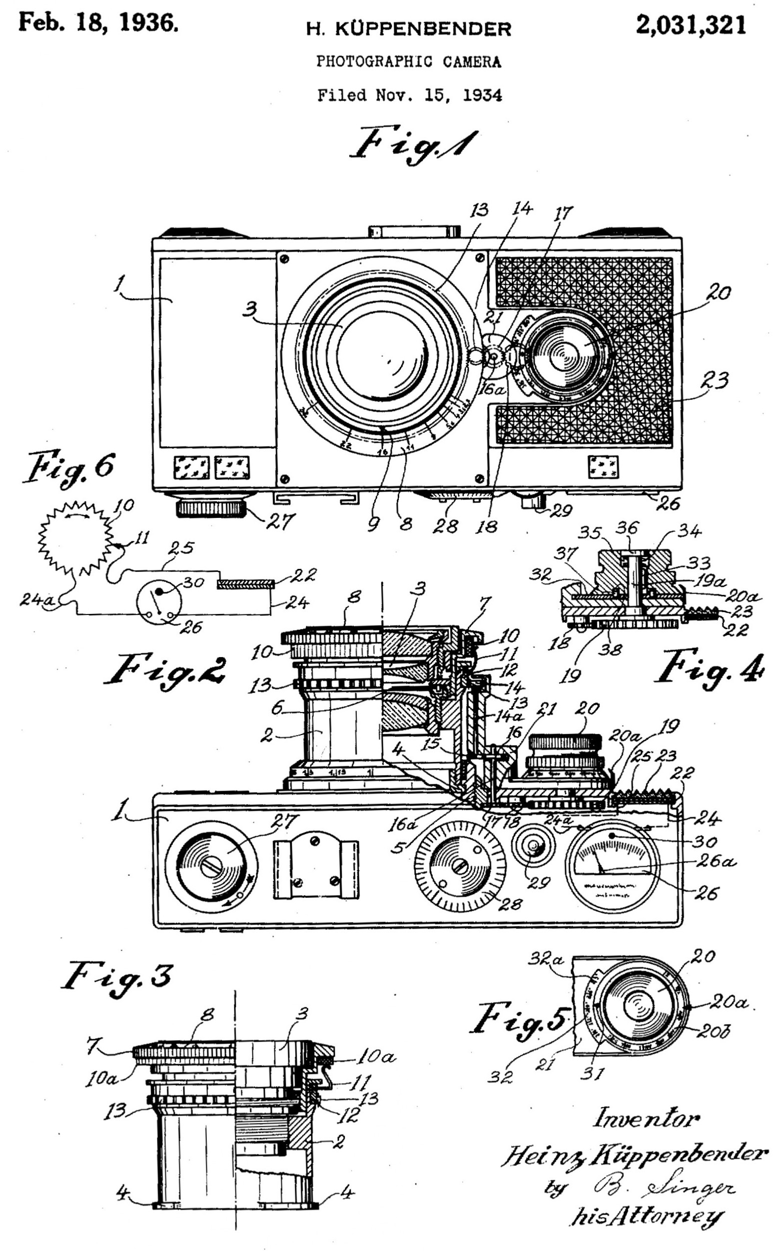 米国特許2031321号 “Photographic Camera” 「コンタックスI」の形状をしているが、露出計を内蔵。