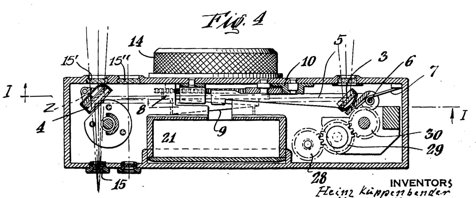 しかし、この配置はハインツ・キュッペンベンダー他が1931(昭和6)年に出願し1934(昭和9)年に取得した米国特許番号1,973,213号“Photograhic Camea With Finder”(左)でも触れられている。この透視ファインダーの配置変更は1934(昭和9)年に出願し1936(昭和11)年に取得した米国特許番号2,040,050号“Combined Photographic Camera And Distance Meter”(右)にあるように、棒プリズムを装備した距離計部の構造変更に伴うのが実際と考えられる。