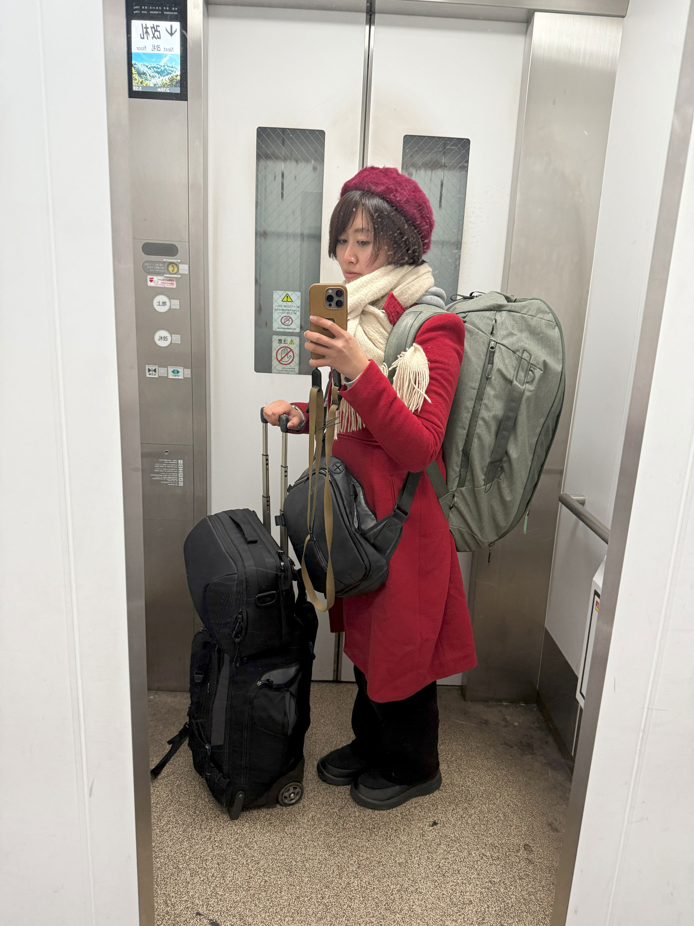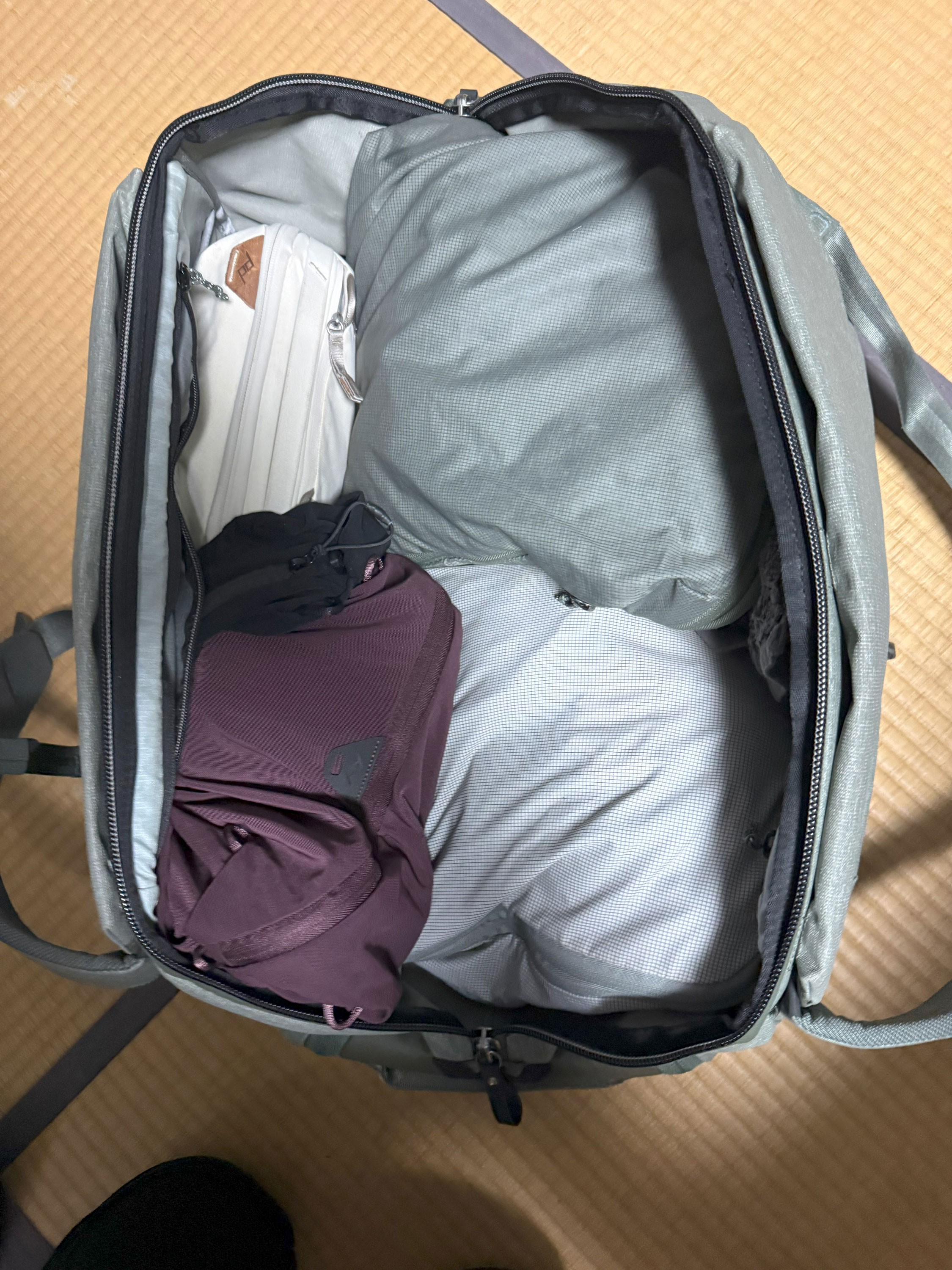 私が持っているバックパックの中で最も大きなものです。容量はなんと65L!衣装や小道具の運搬に欠かせないバッグです。PeakDesignのパッキングキューブを使って整理して収納しています。