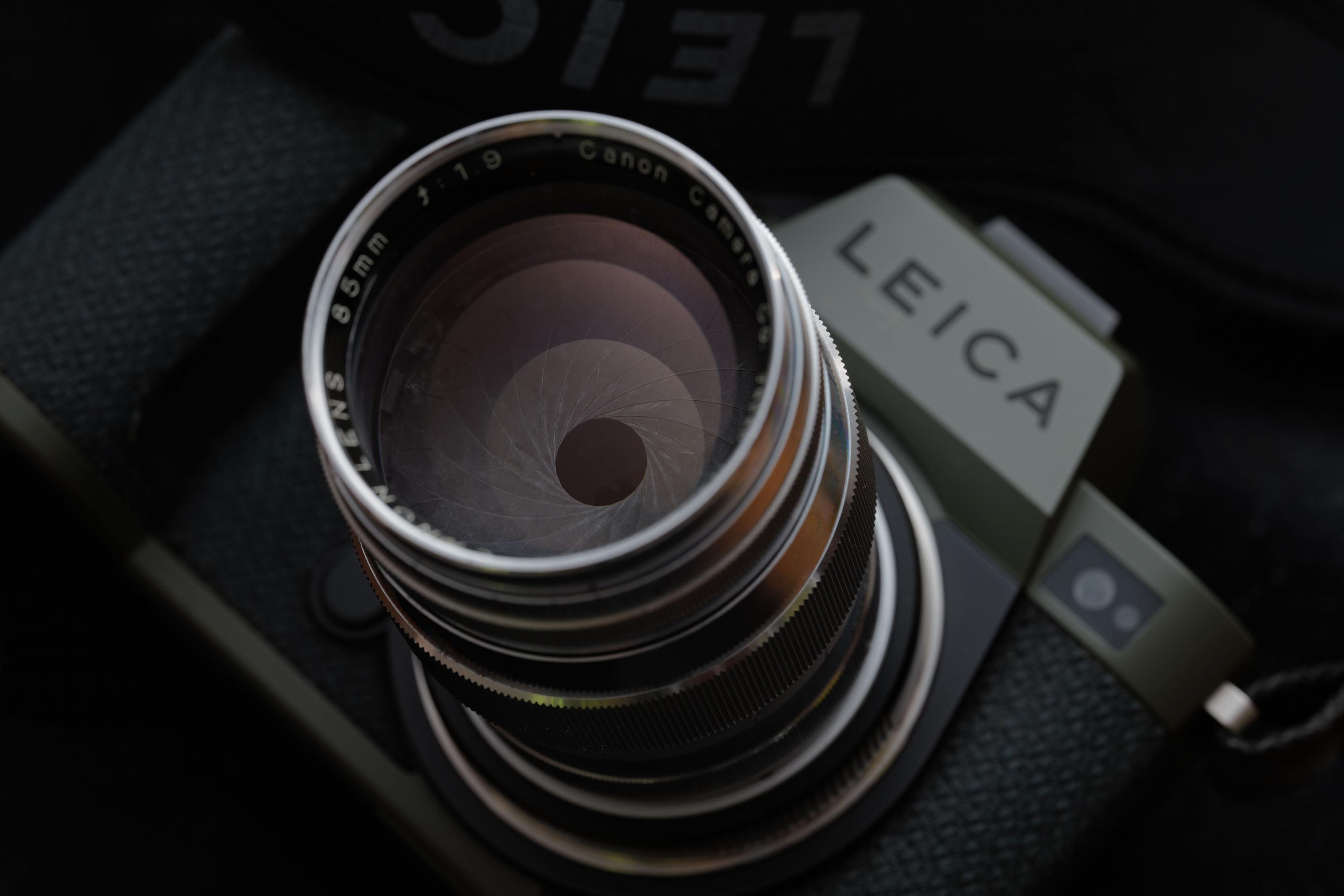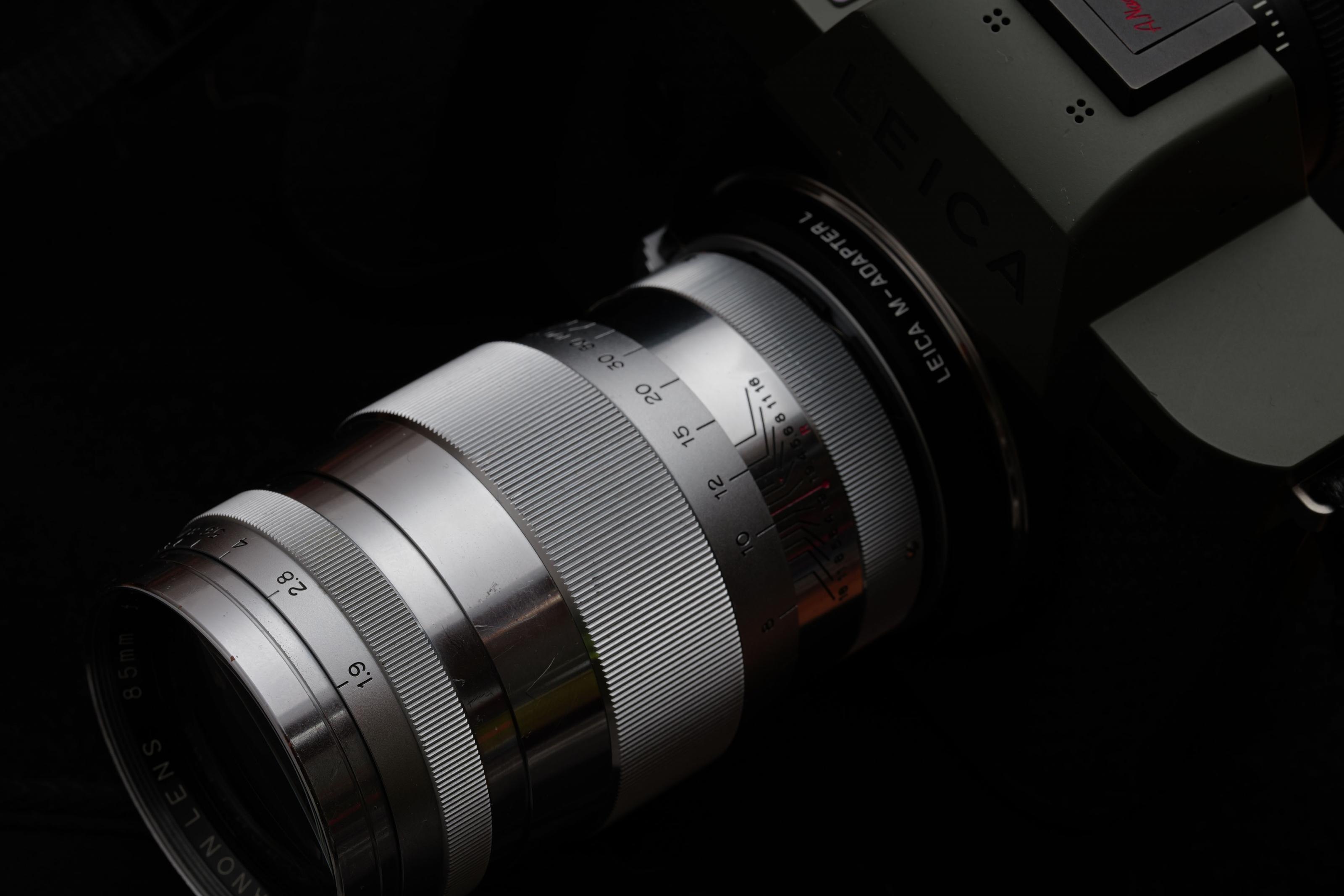 1951年にSERENARの名前で登場し、その後同じ仕様でCANON LENSに名称変更されたライカスクリューマウントの大口径中望遠レンズだ。605gもあるフル真鍮製のボディーにクロームメッキが施されたずっしりと重いガラスと金属の塊で、ピントリングの感触にもかなりの重厚感がある。丁寧に扱われてきた個体なのか、ガタ一つない。