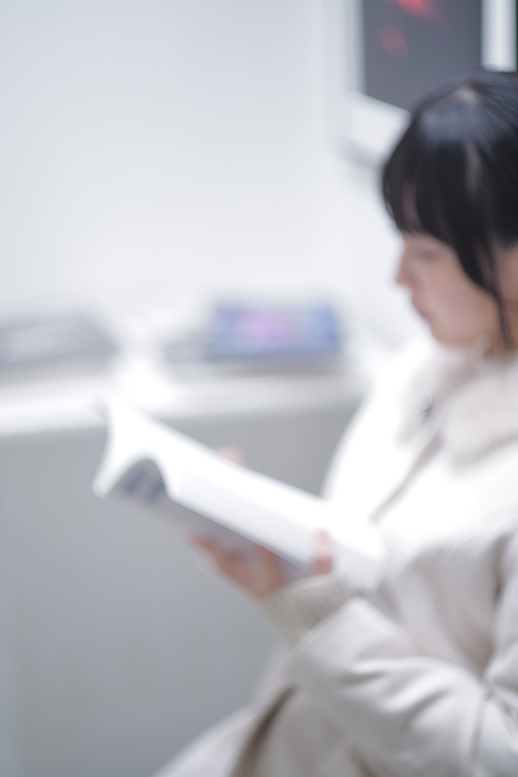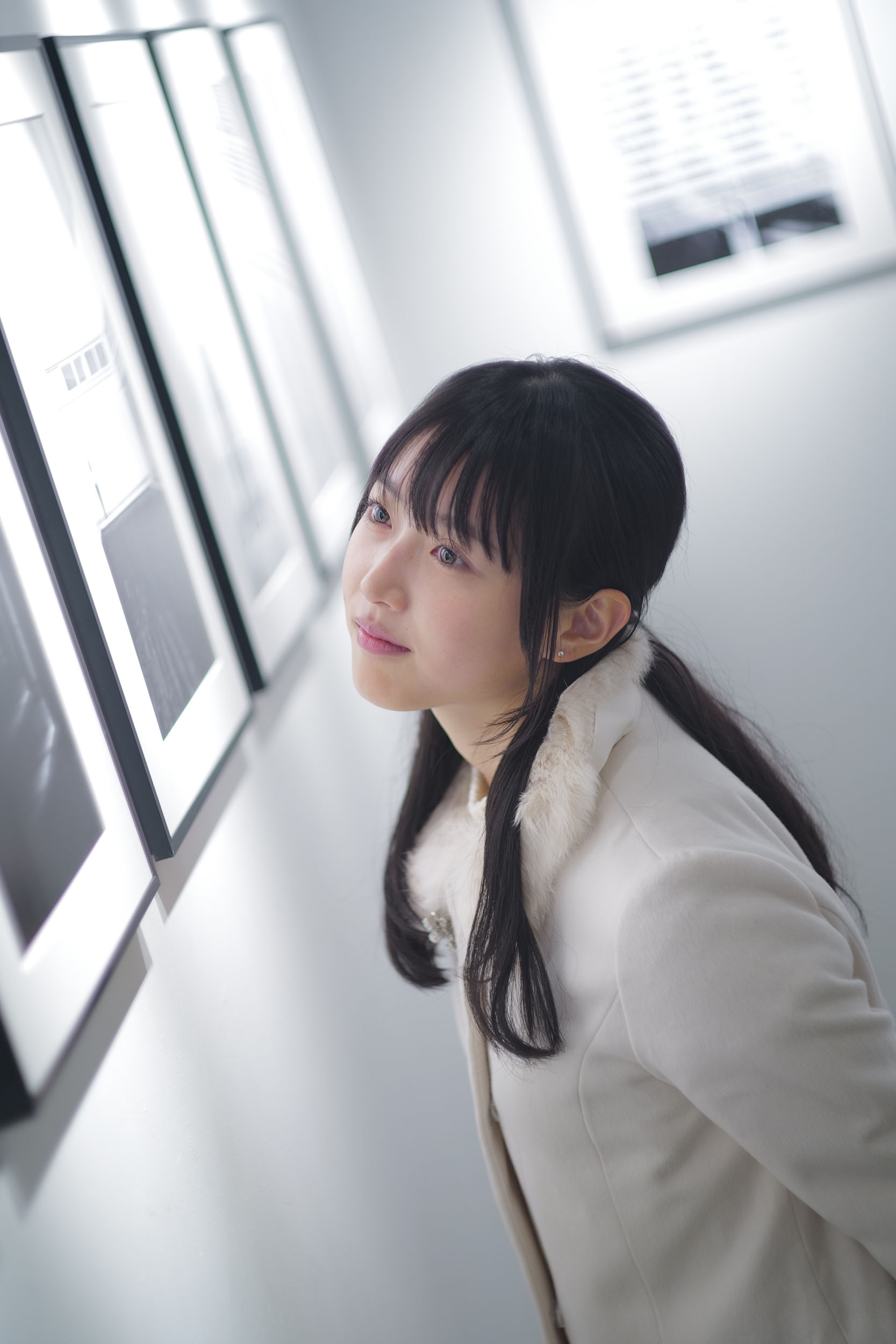 瞳がきらめき、そこに作品が映り込むのが見えた。ファインダーの中で僕は感嘆のため息をつく、この白い空間の中で全てがシンクロしていた、まるで薄いガラスの上に描かれた一枚の絵のような透明感だ。