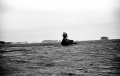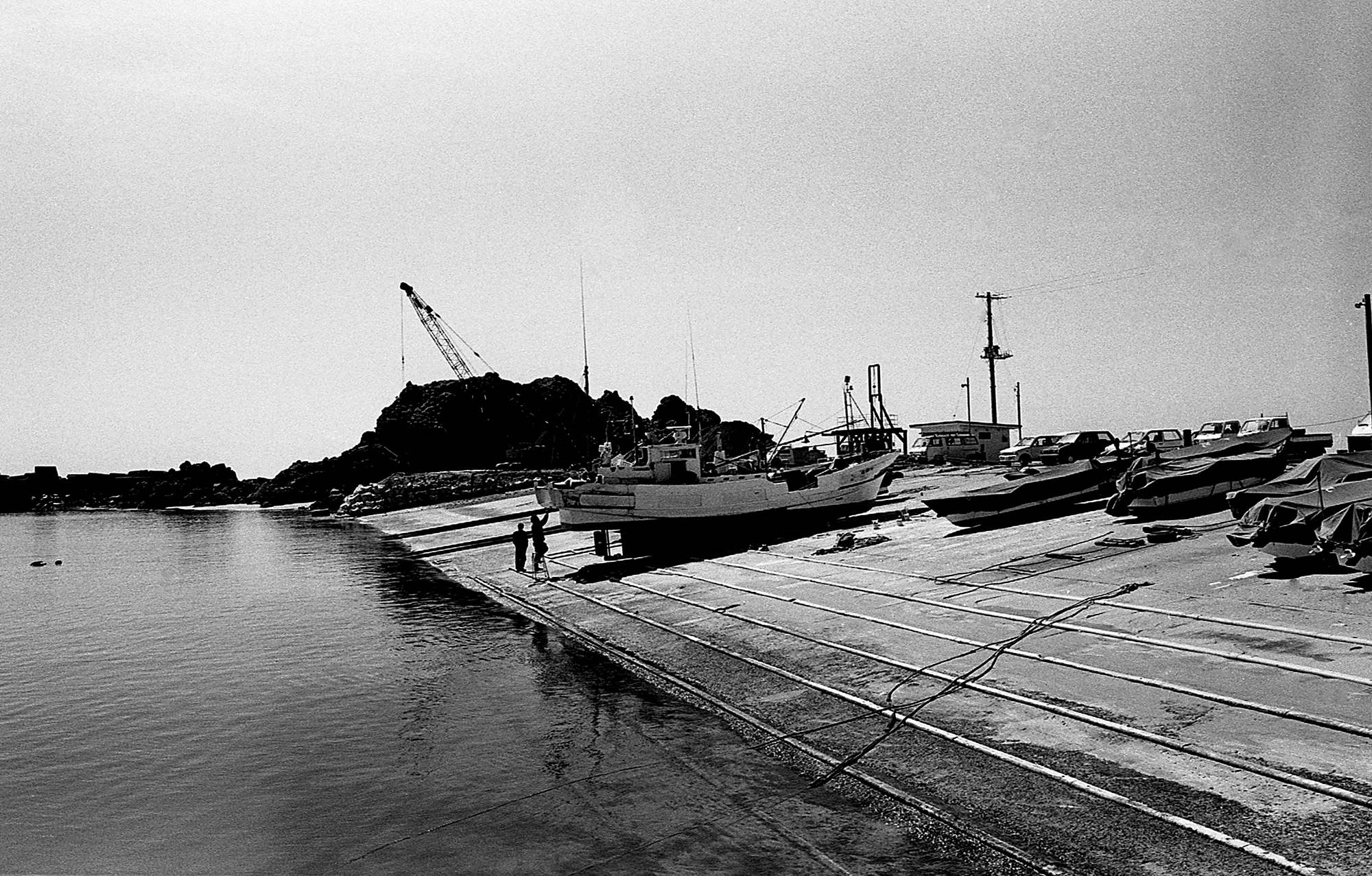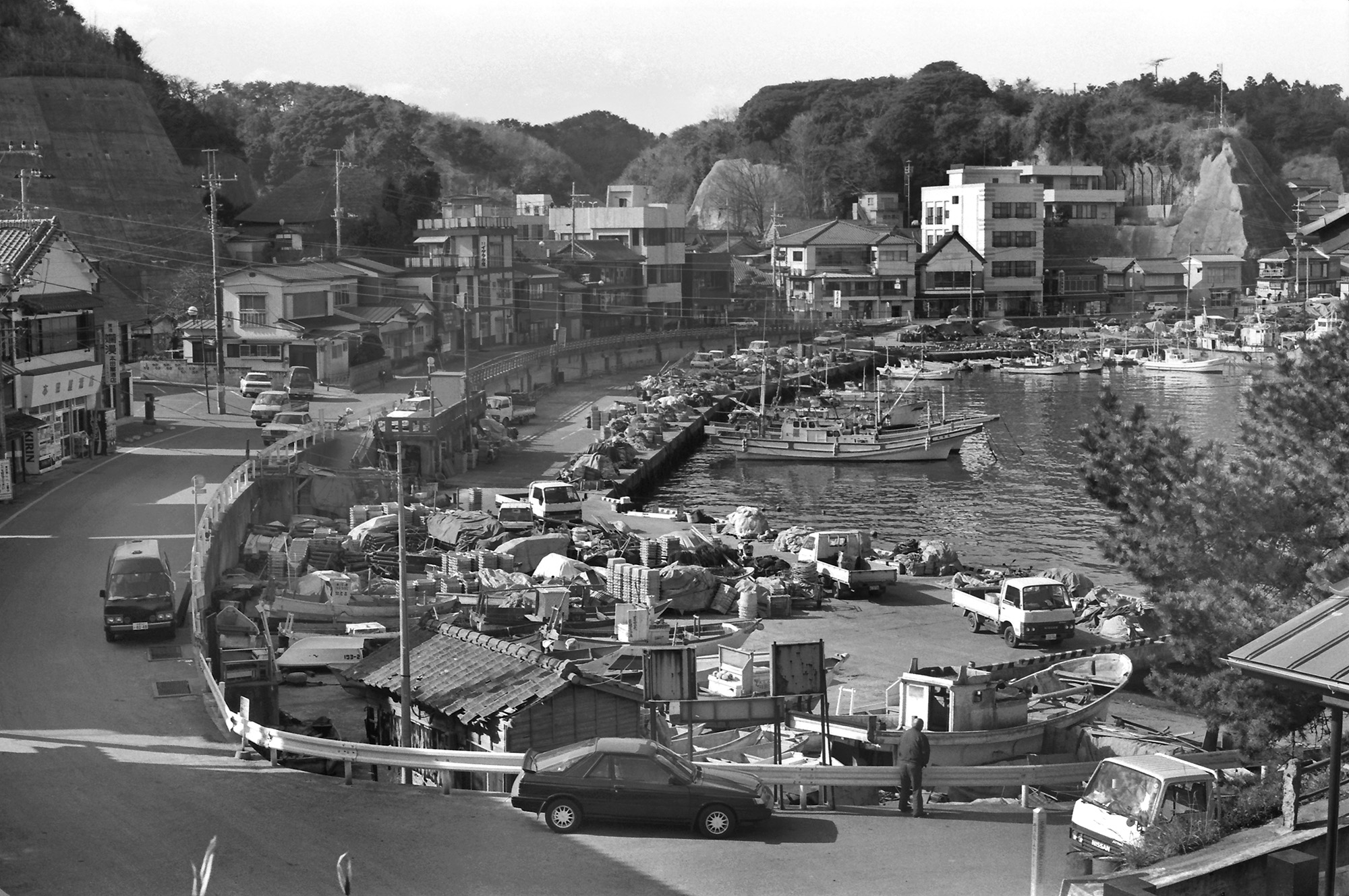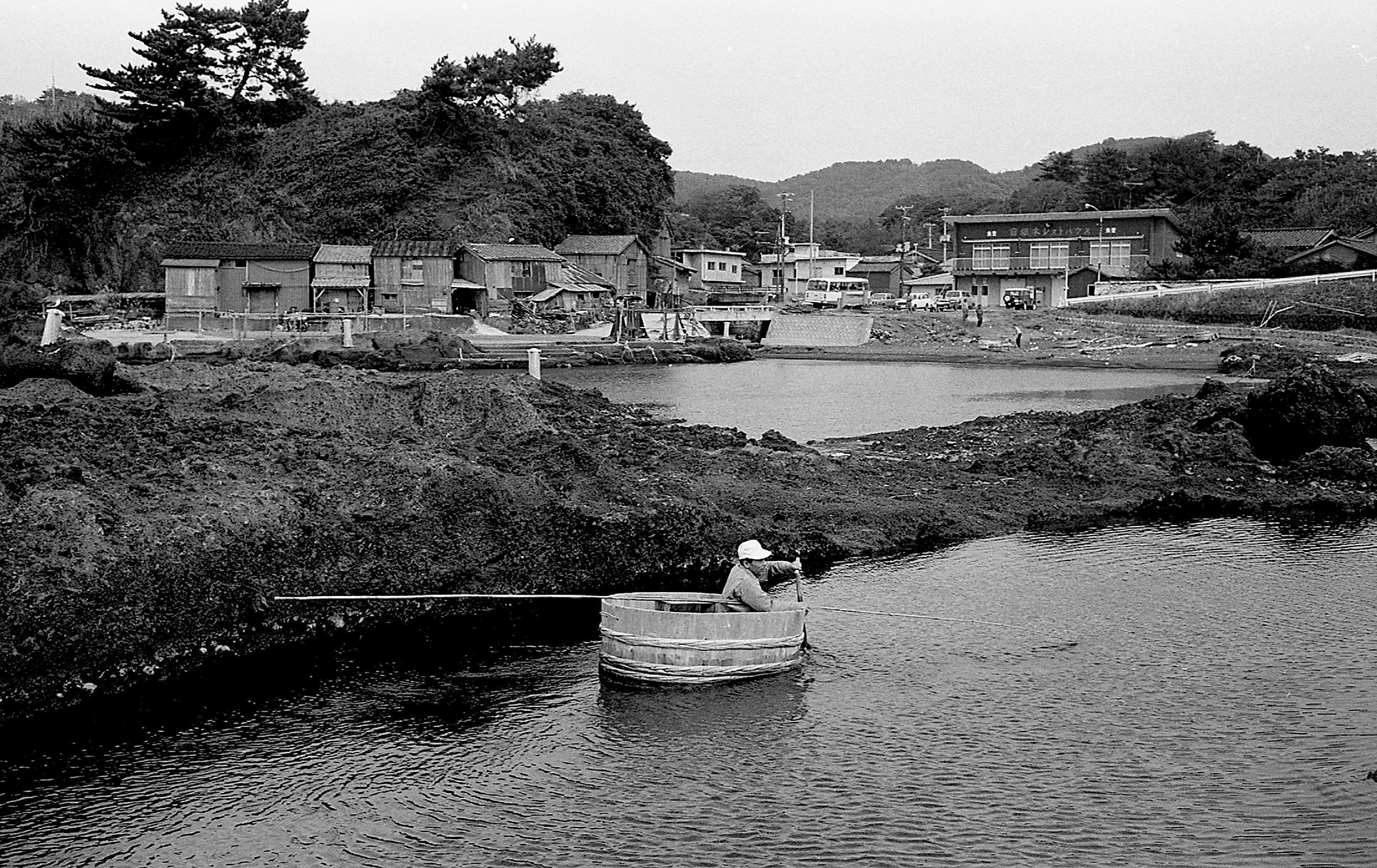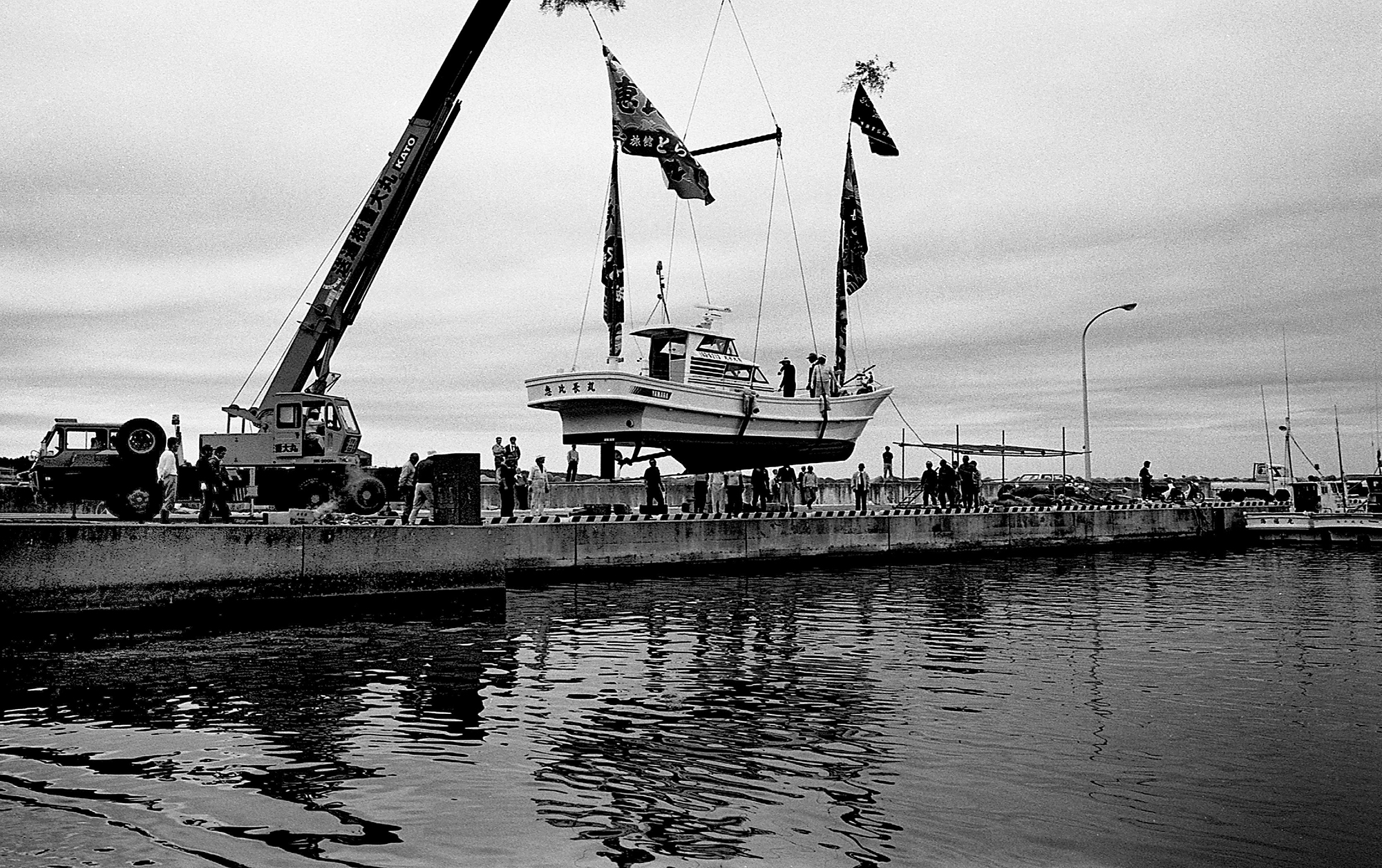 那珂川の河口近くで土手から川を眺めていると、小舟がふわりふわりと動いてきて漁師がウキのついた網を川に放った。椅子に腰かけて川を見ていたおじさんに「何がとれるんですか」と聞くと「サケ」と言った。「11月ごろまでとれるんだけど、昔みたいにはとれないね。今一匹2500円くらいかな」。おじさんの横に腰を下ろしてしばらく話をして、海門橋から河口へ出て那珂川漁港へ。港周辺をぶらついていたら昼になり、魚市場の店で刺身定食を食べる。美味い、安い、と言い続けた。それから海沿いに進み、中世代白亜紀層の岩礁群を眺め、磯崎岬へ出る。小さな漁港に人が集まっているので行ってみると、重機で新しい船を吊り上げて海下ろすところだった。船上に日本の青竹がたてられていて、色鮮やかな大漁旗が揺れていた。造船所からずるずると海へ入っていく進水式風景を以前見たことがある。最近は完成された船を運んでくるらしい。(現・ひたちなか市)