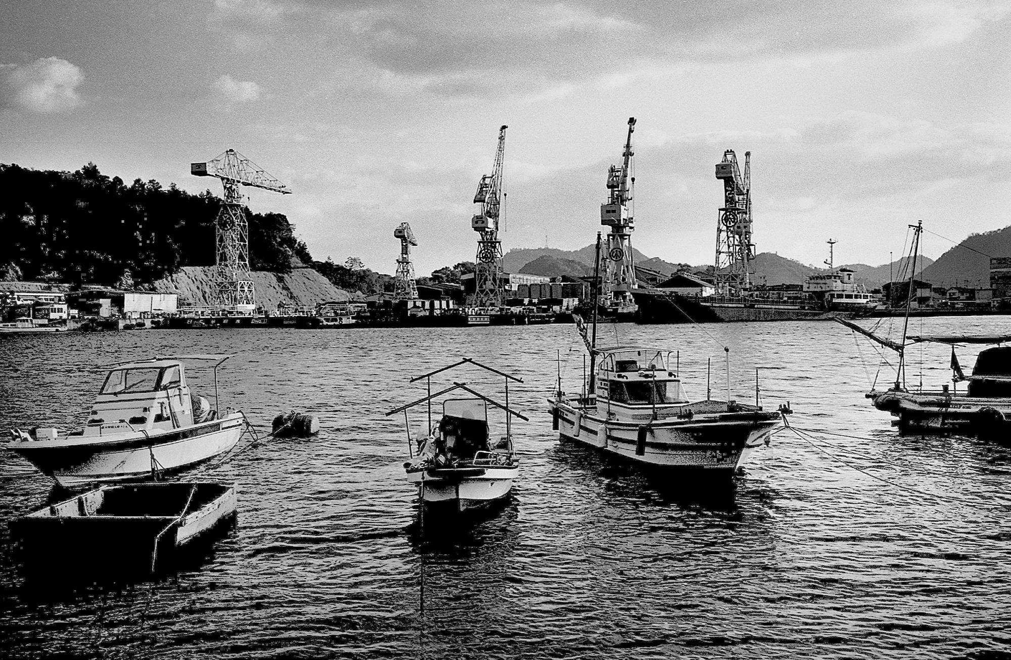 尾道は、港町。坂の町。寺の町。海辺に小さな商店がひっついて並んでいる。海辺の石段にちょぼちょぼと波が寄せている。船着き場に向島からの渡し船がついて、自動車5台とバイクに乗った男と自転車の女性そして高校生たちが降りてきた。買い物帰りらしい女性と自転車を引いた男と自動車3台を乗せて船は戻っていった。釣りをしている人がいる。一眼レフで海辺を写している女性がいる。港に係留されている小舟が揺れている。向島の日立造船の大きなクレーンがゆっくりと動いている。「昨日は強い風が吹いたけ、寒かったの。今日はぬくいわあ」と女性の声が聞こえた。