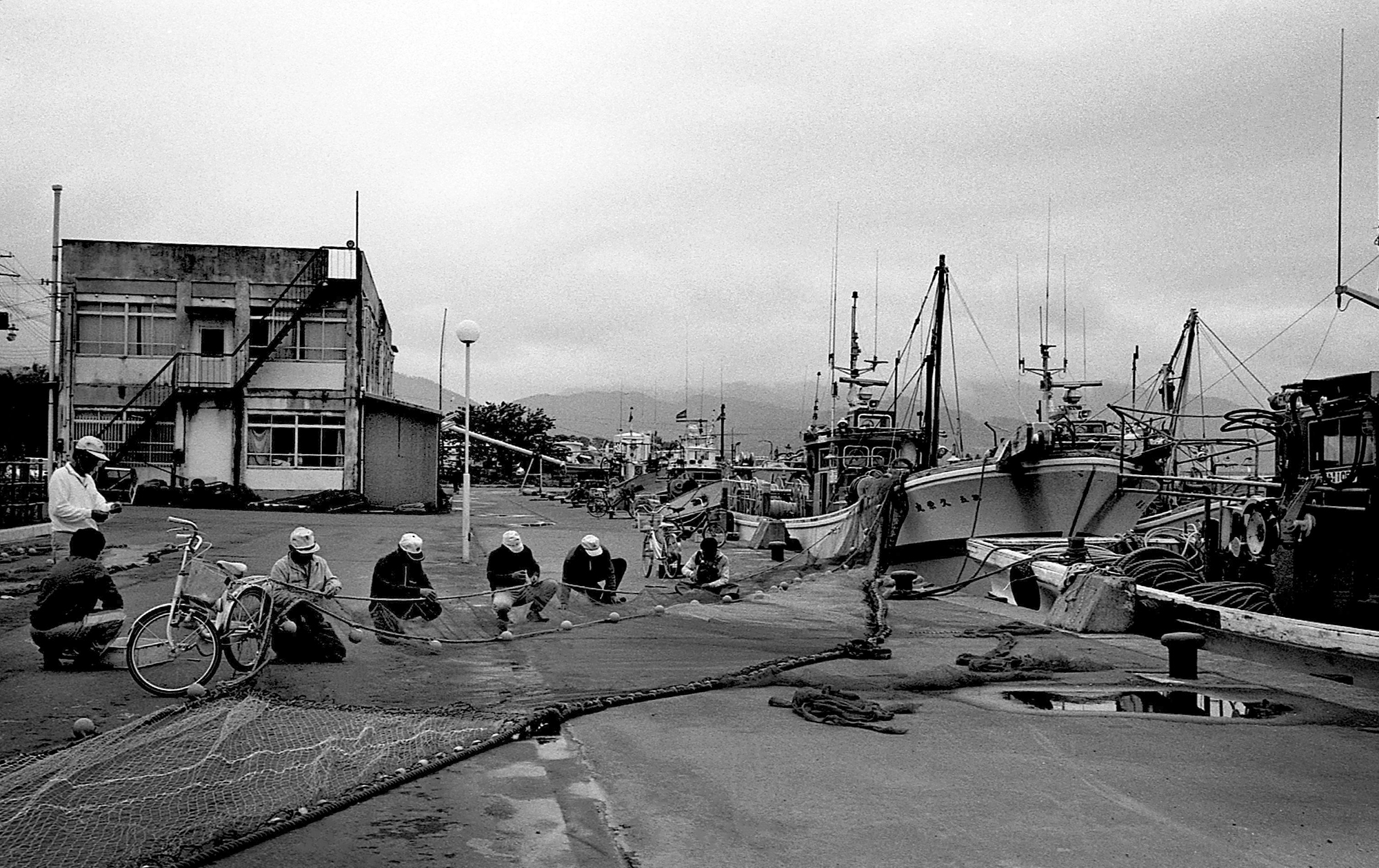 家の軒につるした網にカレイやイカが干してあり、それをとろうと三毛猫がうろうろしている。うまくいかず結局捨て台詞のような鳴き声を発して路地の向こうに消えた。海面にはカモメ群が浮かんでいて、船のエンジン音がすると飛び立った。その上をトンビがくるりくるりと回っている。小さな船が帰ってきた。「ナマコですね」「そうそう」ナマコは海鼠と書くのだが、ハツカネズミのようにかわいい感じではなくドブネズミのようで、ぬるぬると動いているのを見ると、日本酒飲みながらカリコリとかむ時の幸せな気分は浮かんでこないのだった。「写真撮ってるのかあ」と船から上がってきた老漁師が声をかけてきて、しばらく話をした。「1キロ、買うてんか」と言う。持っていけないからと断ると、そうか、と言ってプイと話を打ち切り自転車に乗って行ってしまった。