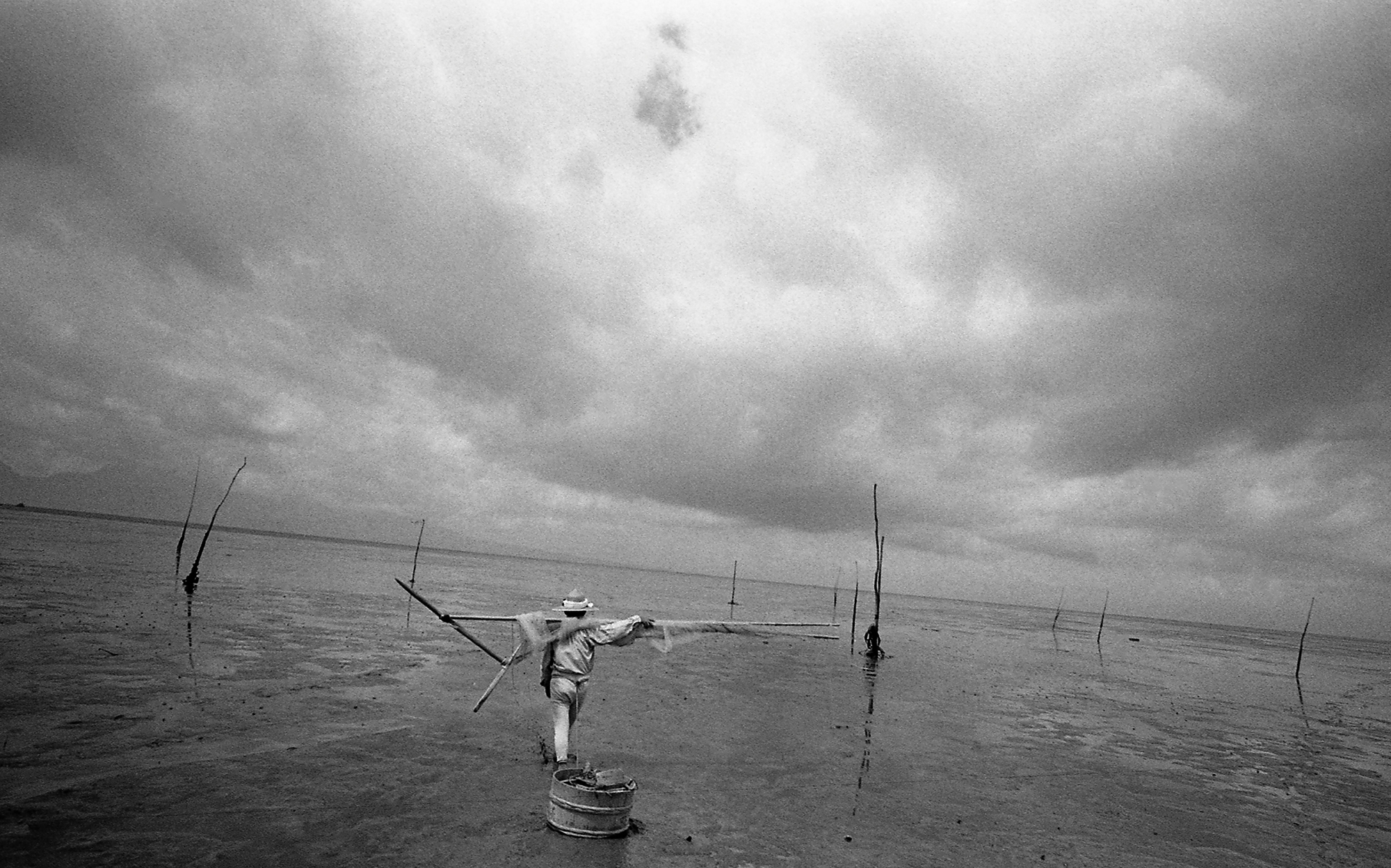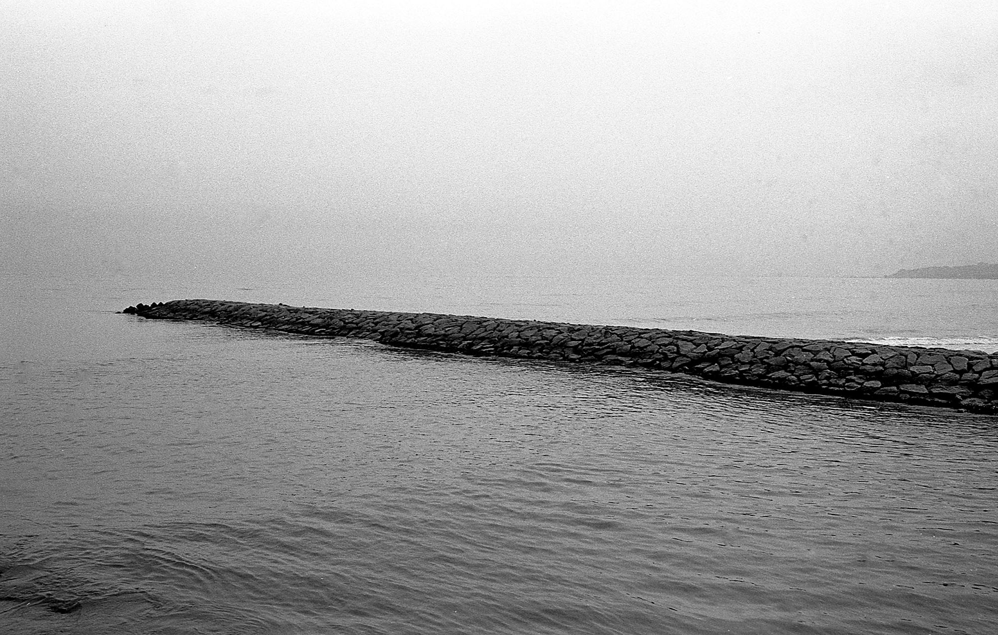 「公害」という言葉が日常のふつうの会話に使われていた1970年代、雑誌の取材をかねて何度か九州の地へ行きました。有明海-諫早市・三池港・大牟田市・長洲町。八代海-水俣市、島原湾-宇土市・天草市。鹿児島県志布志町。『取材』テーマは「開発・公害」ですから工場排水による汚染現場を撮影するのですが、汚染された海を強調するように写していることにうんざりして、ふつうの海の光景を写して歩いたのでした。漁村の海辺を歩いていると、有明海の記憶が波打ち際にひろがる無数の小石の上をすべる波の音のようにさらさらさらとあらわれてくるのです。たとえば漁網の手入れしている老漁師の近くに腰を下ろして話を聞いているような時のさびの聞いた声まで聞こえてきます。今、私はかつて出会った老漁師たちの年齢になっていています。時を経て見る写真は新しい。その時その場所にタイムスリップして、年寄り二人がゆったりと会話しているのです。(写真・1973年)