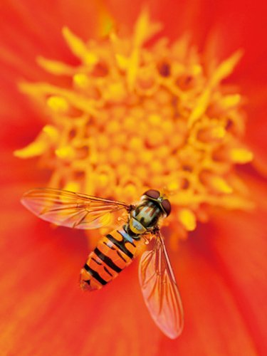 | とまっている花の色で華やかに いまひとつパッとしない昆虫でも、花などとまっている場所が色鮮やかで魅力的ならフォトジェニックな仕上がりになります。 100ミリマクロ プログラムオート(F8、1/125秒) +0.3EV ISO200 WB:オート シングルAF |