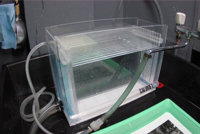 | 【水洗機】 大型シンクに備わった水洗機。 これにより印画紙を均一に水洗いすることができる。さすがにこれを自宅に用意するのは大変。
