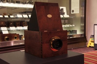 | カメラ・オブスクーラ(レプリカ) カメラの原点となった絵を描くための道具。ピンホールから入った映像が内部のミラーにより反射、上から覗いて上下が成立した像を見ることが出来る。