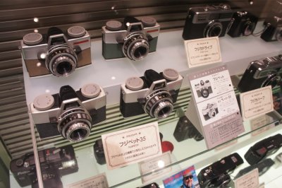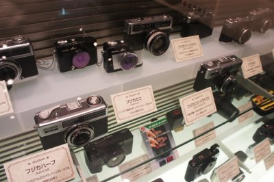 | 壁面には、富士フイルム社製以外の歴代のカメラも展示。 手前のガラスケースには、同社の総ラインナップを展示。 カメラの技術革新とデザインの変化を俯瞰することができる。 |
