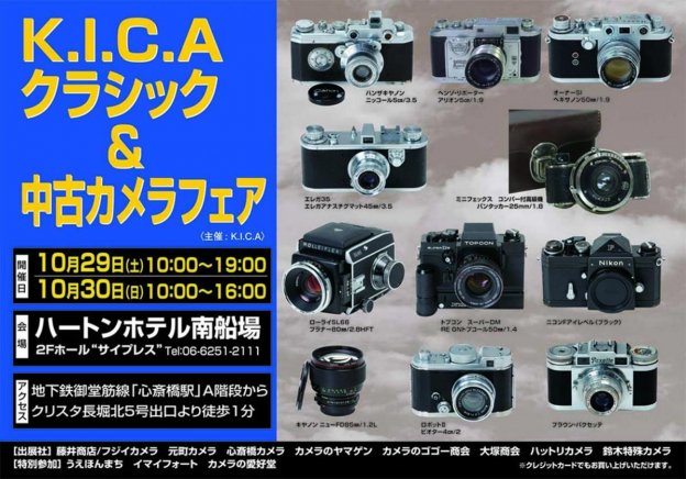 10月29日(土)・30日(日)の二日間にわたり、大阪の心斎橋のハートンホテル南船場にて「K.I.C.Aクラシック&中古カメラフェア」が開催されます。カメラファンの加盟店も出店しますので、興味のある方は是非足をお運びください。