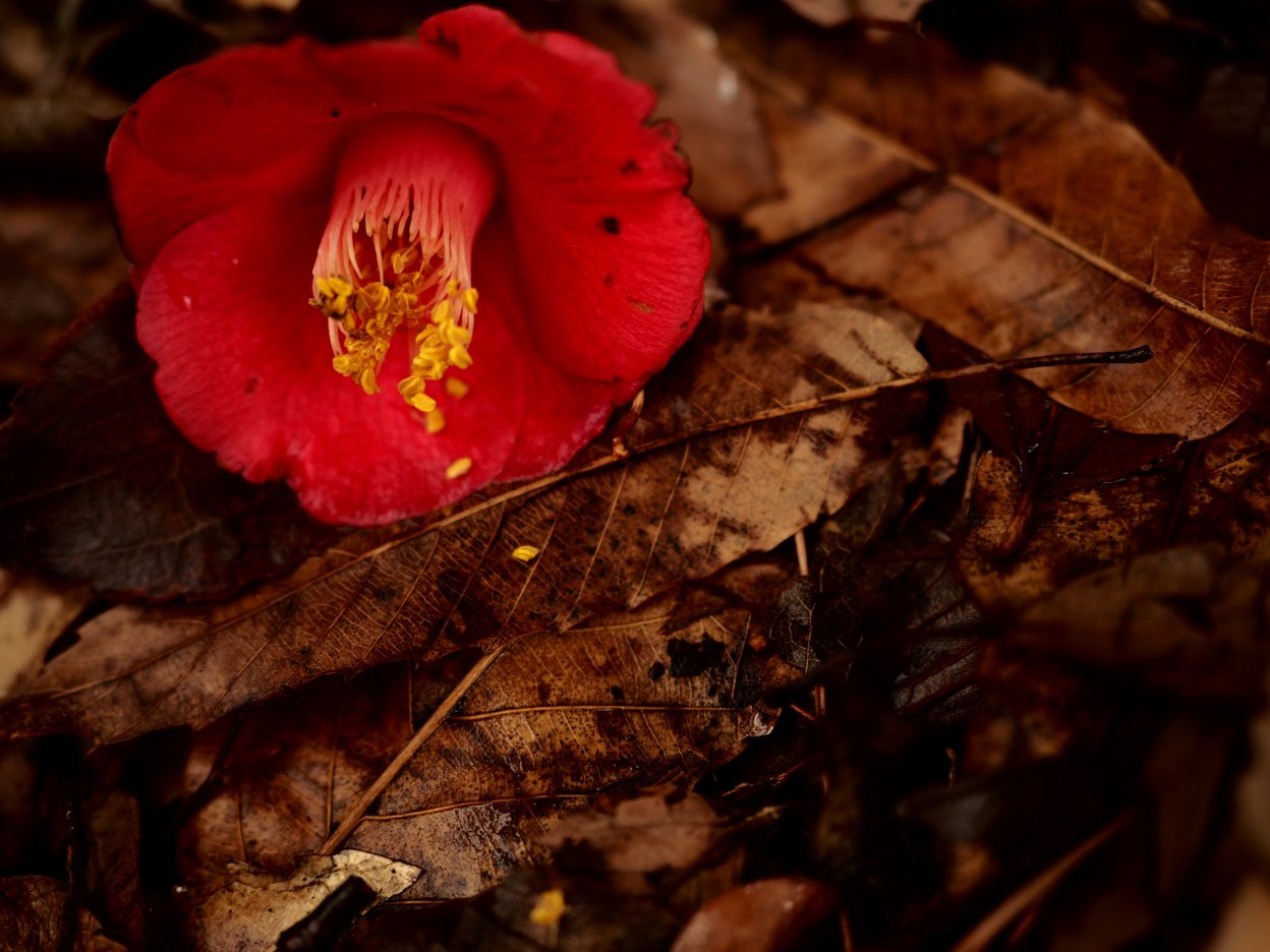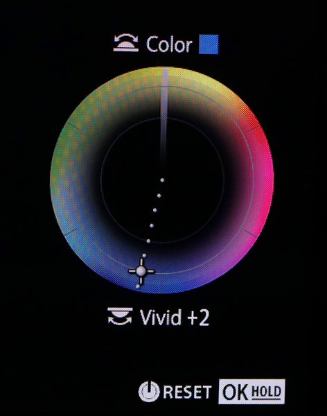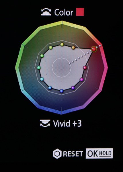 今度は「落ち葉の中に落ちている赤い椿の花が美しい」と感じたとします。その時には、クリエイティブダイヤルで「COLOR」(カラープロファイルコントロール)を呼び出します。そこで、赤を選択し、彩度を上げます。また、赤以外の色はすべて彩度を下げます。そうすると、画面全体でみたとき、椿の赤だけがぐっと強調されるので、美しいと感じた「赤い椿の花」を印象付けることができます。