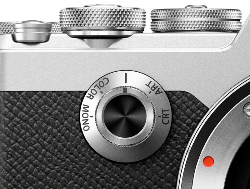 色を調整する際に役立つのが、PEN-Fの「カラークリエイター」と「カラープロファイルコントロール」機能です。この2つは、カメラの前面にあるクリエイティブダイヤルを回すと呼び出せます。前者の「カラークリエイター」は全体的な色調と彩度を、後者の「カラープロファイルコントロール」は、個別の色の彩度を調整することができます。 オリンパス PEN-F ボディ前面 クリエイティブダイヤル