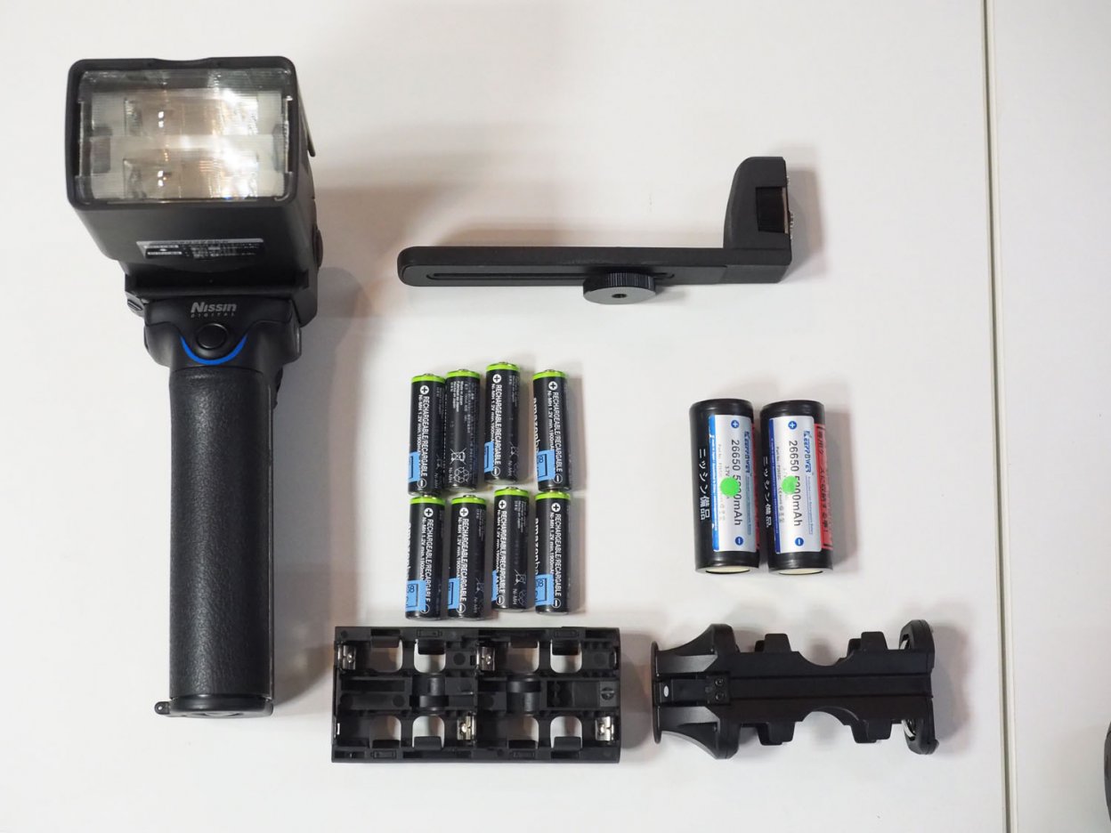 MG10本体とカメラの装着するブラケット。26650タイプのリチウムイオン充電池とホルダー。単三電池とホルダー。