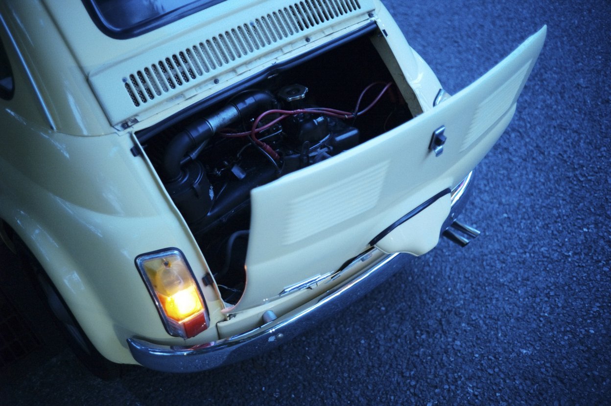 600ccのエンジンにアバルトマフラーが装着されたエンジンが後席の後ろに乗っかっている。ここはトランクリッドではなく、エンジンフードであり、撮影ポイントである。MINOLTA M-ROKKOR 40mm F2 1/180秒 F2 ISO6400