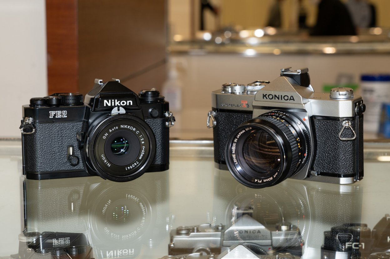 (左)ニコンFE2 28,000円 + GNニッコール 45mmF2.8 25,000円 / (右)コニカオートレフレックスT3 15,000円 + ヘキサノンAR 50mmF1.4 10,000円