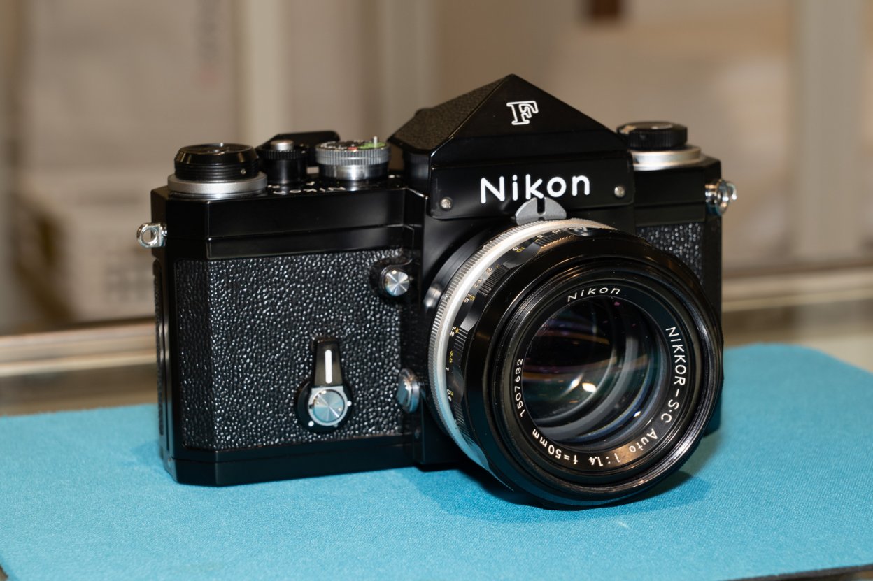 1959年、ニコン初の一眼レフカメラとして発売。高い堅牢性が評価された。Fマウントを初めて採用した機種であり、露出計は非搭載だが、ファインダーの交換により露出計の追加やTTL測光などが可能になった。出品された個体は左肩に「Nikon」と銘打たれた後期型。