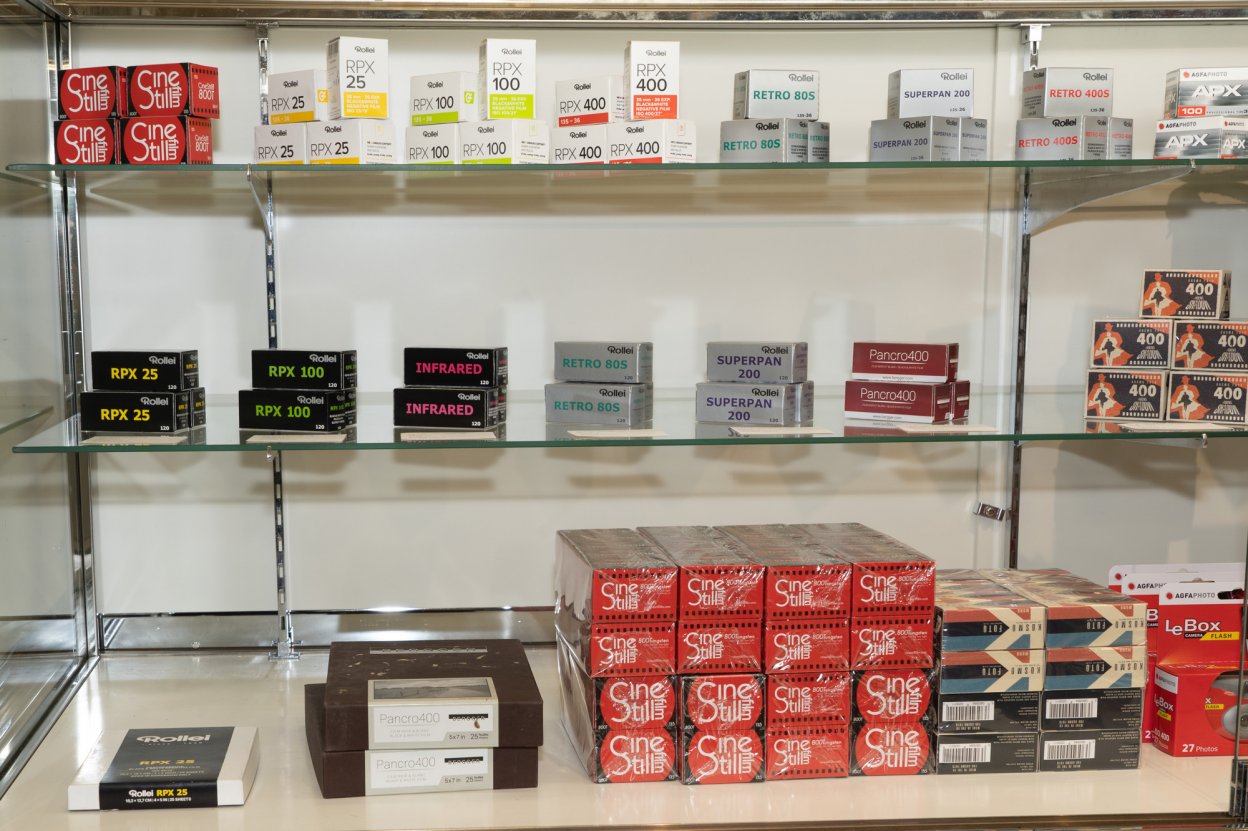 ローライ(Rollei)、ベルゲール(Bergger)、シネスティル(Cinestill)、コスモフォト(KOSMO FOTO)のフィルムを販売。中でもシネスティルの「800T 135-36」は、色温度の低いタングステン照明下での撮影時にホワイトバランスを合わせる目的で使用されるフィルム。今回販売している中では唯一のカラーネガフィルムとなる。それ以外はモノクロネガフィルム。カメラファンスタッフがテンション爆上がりの珍品