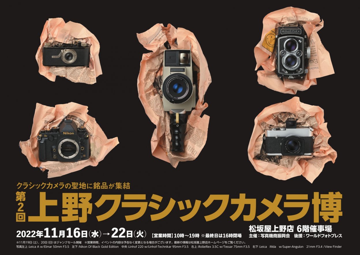 東京・上野にある松坂屋上野店において、「第2回上野クラシックカメラ博」が開催中だ。期間は2022年11月22日(火)まで。主催は写真機商振興会。今回は中古カメラ店や用品メーカー合わせて12社が参加しており、19日(土)と20日(日)にはジャンク品のカメラやレンズのセールも実施する。