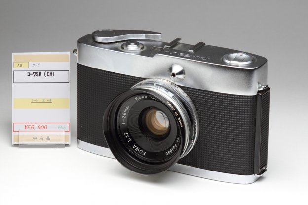 コーワSW コーワSWは、28mmF3.2の広角レンズを固定装着する35mm判レンズシャッター機である。風邪薬の「コルゲンコーワ」で有名な興和株式会社の光学機器部門が1964年に製造を開始。当時、高価であった一眼レフ用の広角レンズよりもリーズナブルなプライスで販売された。ピント合わせは目測式。フォーカスリングの1mと3mの部分にクリックを備えたシンプルなものだ。撮影レンズの上にある円錐状の先端にファインダーの前玉がある。