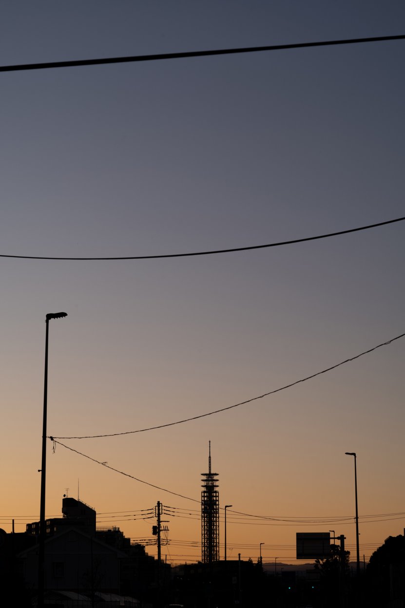 西東京市のシンボル、スカイタワーを中心に両側の街灯と電線で画面をデザインした。普通のことを整理して美しいものを作り上げたい、そんな人生にしたい。それが写った。
