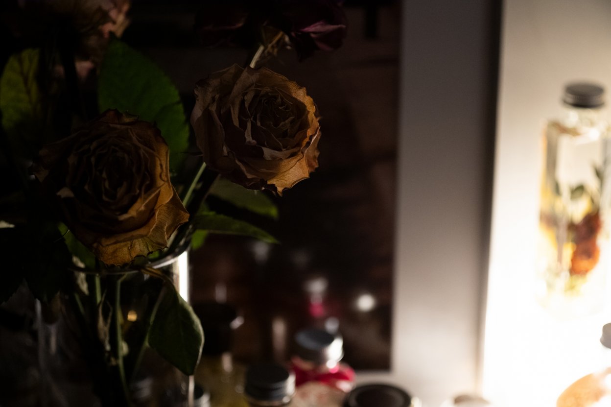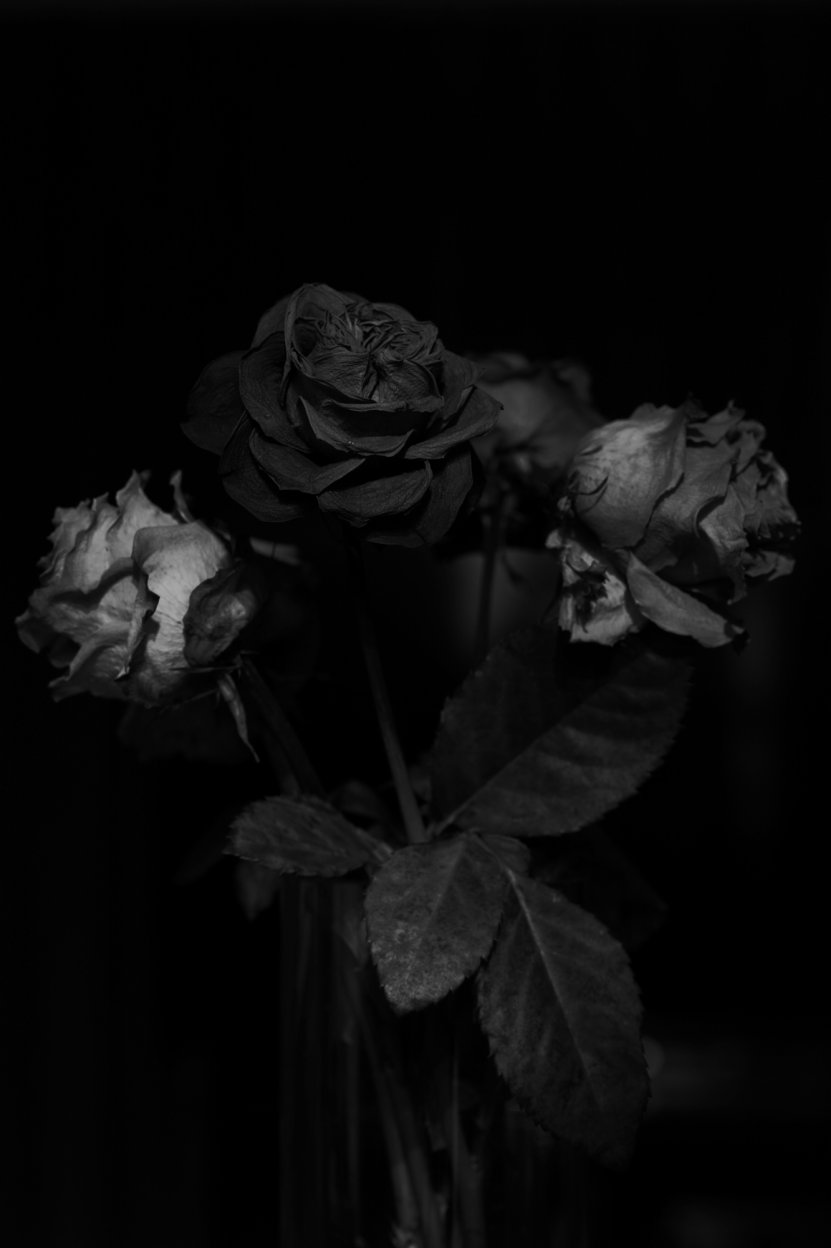 そのはざまに死の形があり、それを儚くも美しいものとして受け入れ、写真にしていく。薄暮の空や、弾力を失ったバラがレンズを通して心に突き刺さる。