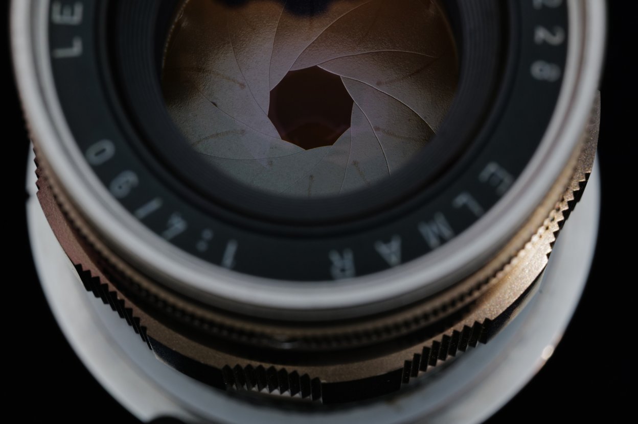 下に写っている一本は珍しいLマウントのもので、上のもう一本はMマウントだ。よく見ると絞りリングとピントリングの位置関係が随分と違う。Mマウントのレンズは絞りをF8に合わせて(そもそもクリックがF8からずれている)ピントリングを無限遠側から回してポンチマークが真上にくるところまで持ってくると距離指標は約2.4mになるが、Mマウントの方は6mぐらいのところとなる。これは2本使ってみて気がついたのだが、いやあ、全然使い勝手が違う。ヘリコイドが外れてビゾフレックス対応が可能な仕様になっているので、こういう事も起きるのだろう。ちなみにLマウントのレンズはトリプレットになったエルマーの生産初期に約500本だけ生産された希少なレンズとなる。